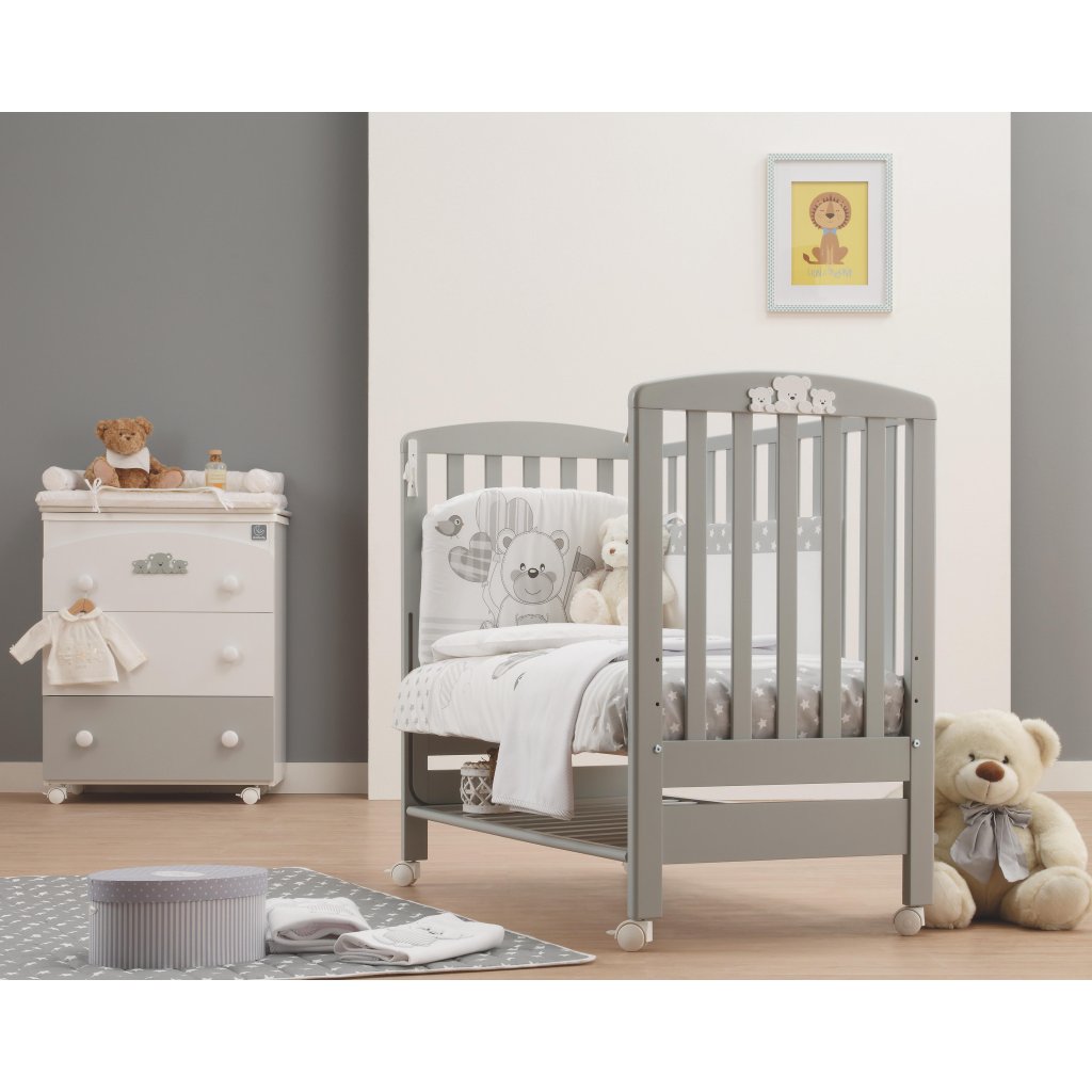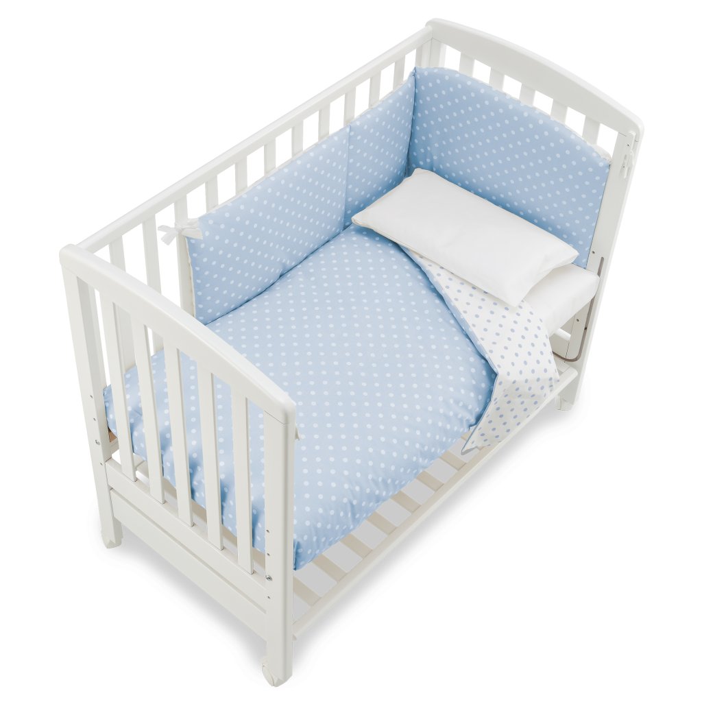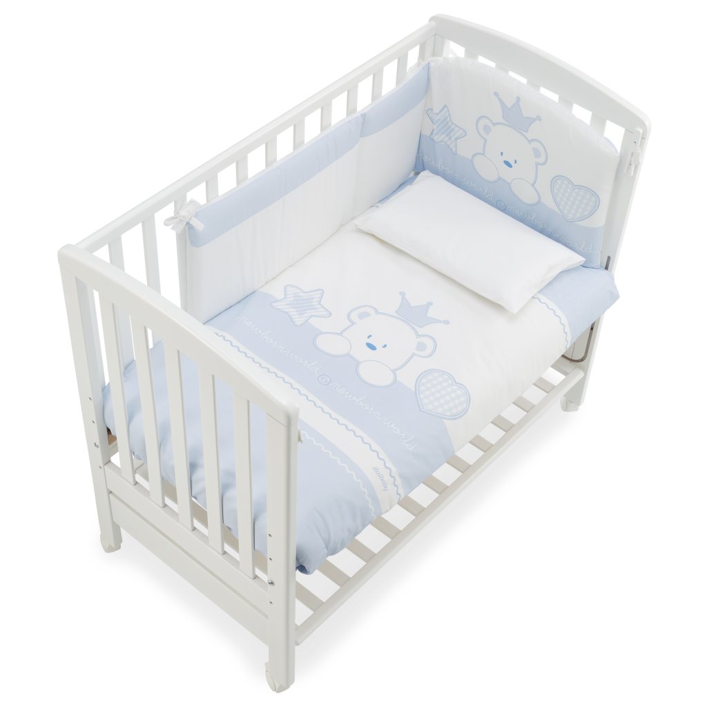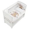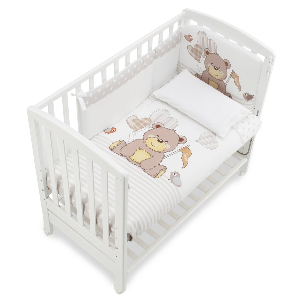 Balenie obsahuje: postieľka, kolieska, matrac a posteľný set ( mantinel, paplón, obliečku na paplón a obliečku na vankúš)