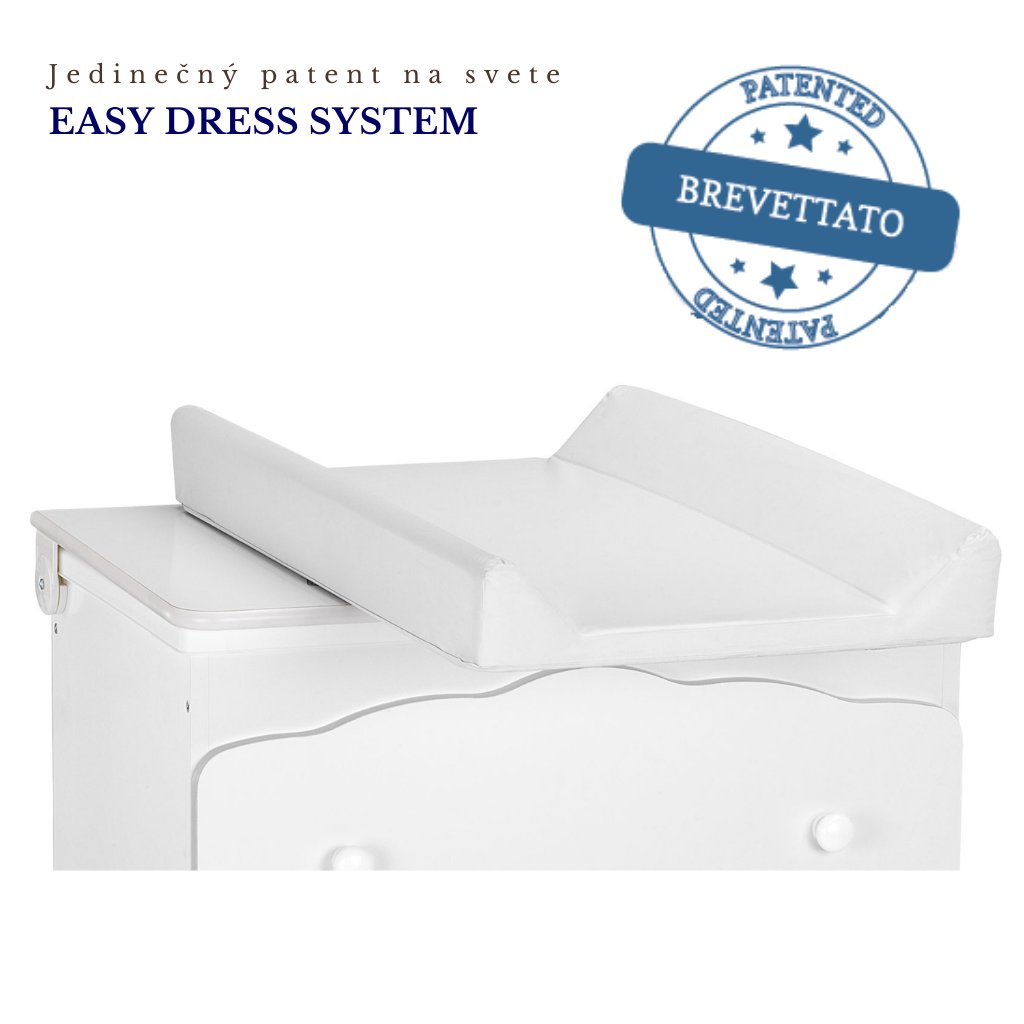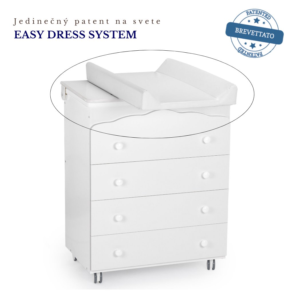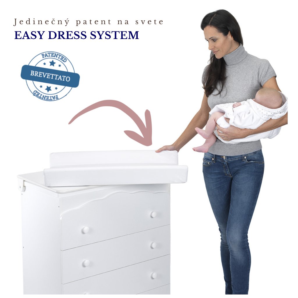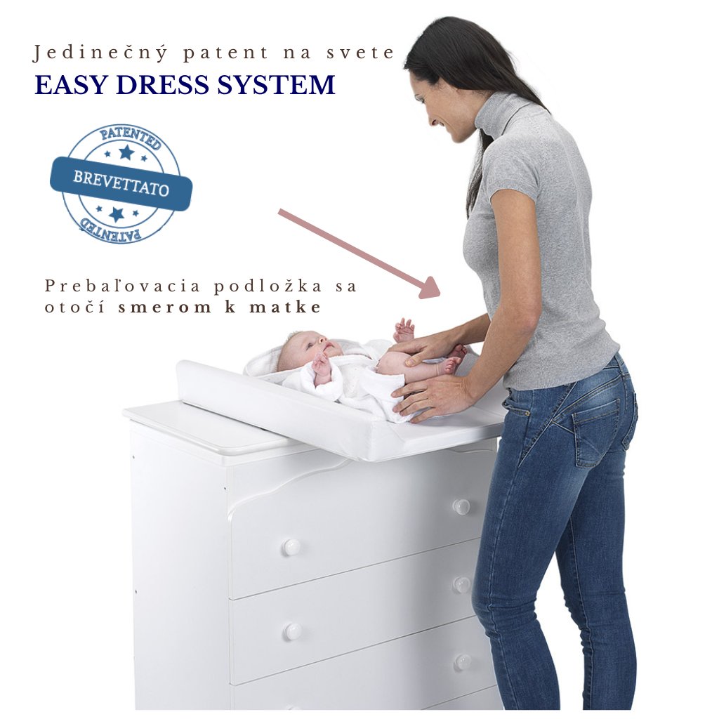 Patentovaný systém Easy Dress Spoločnosť Italbaby, ktorá vždy dbá na potreby mamičiek a na kvalitu svojich výrobkov predstavuje úplne nový revolučný výrobok, systém Easy Dress na prebaľovanie. Okrem známych vlastností detskej vaničky a prebaľovacieho pultu pridala spoločnosť Italbaby k tomuto produktu jedinečný patent na svete, o ktorom sa predpokladá, že matke uľahčí kúpanie, prebaľovanie a bezpečné a pohodlné obliekanie dieťaťa. Všetky výrobky, ktoré sú teraz na trhu núti matku, aby s dieťaťom na prebaľovacom pulte zaobchádzala "neprirodzene". Stáva sa to preto, že bezpečnejším a prirodzenejším spôsobom prebaľovania, starostlivosti a obliekania dieťaťa je umiestnenie dieťaťa "pred mamou", a nie stranou. Systém "Easy Dress" predstavuje riešenie tohto problému. Jednoduchým pohybom sa prebaľovacia časť otočí z vodorovnej polohy do kolmej polohy "priamo k matke". Toto umožňuje matke konať praktickejšie. Priestor, ktorý zaberá rotujúca plocha zodpovedá priestoru, ktorý zaberá detský pult, takže nevyžaduje ďalšie priestory po stranách. Voľný priestor môžete využiť na odloženie detskej kozmetiky, plienok a iných drobností nevyhnutných počas prebaľovania bábätka.
