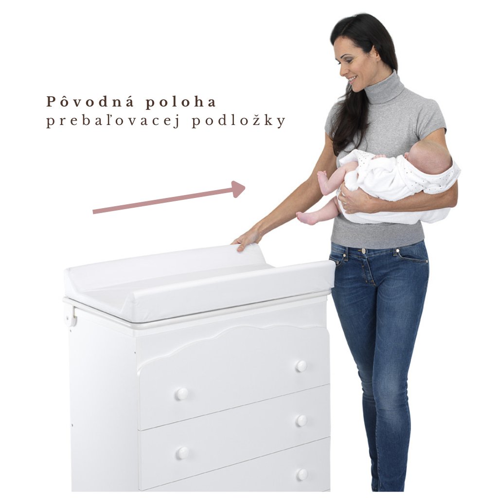 Užitočná komoda na prebaľovanie a kúpanie bábätka až do 12 mesiacov s 3 priestrannými zásuvkami, do ktorých vložíte všetky potrebné veci Vášho bábätka. Prebaľovací pult na...