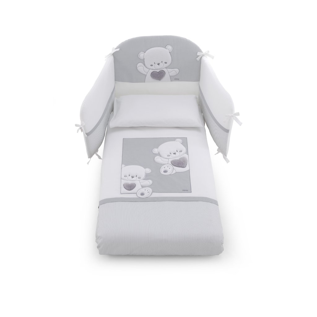 Kompletný 5 dielny set obsahuje: mantinel, paplónik + návliečku, plachtu na matrac a návliečku na vankúšik. 100% bavlna, vyrobené v Taliansku.
