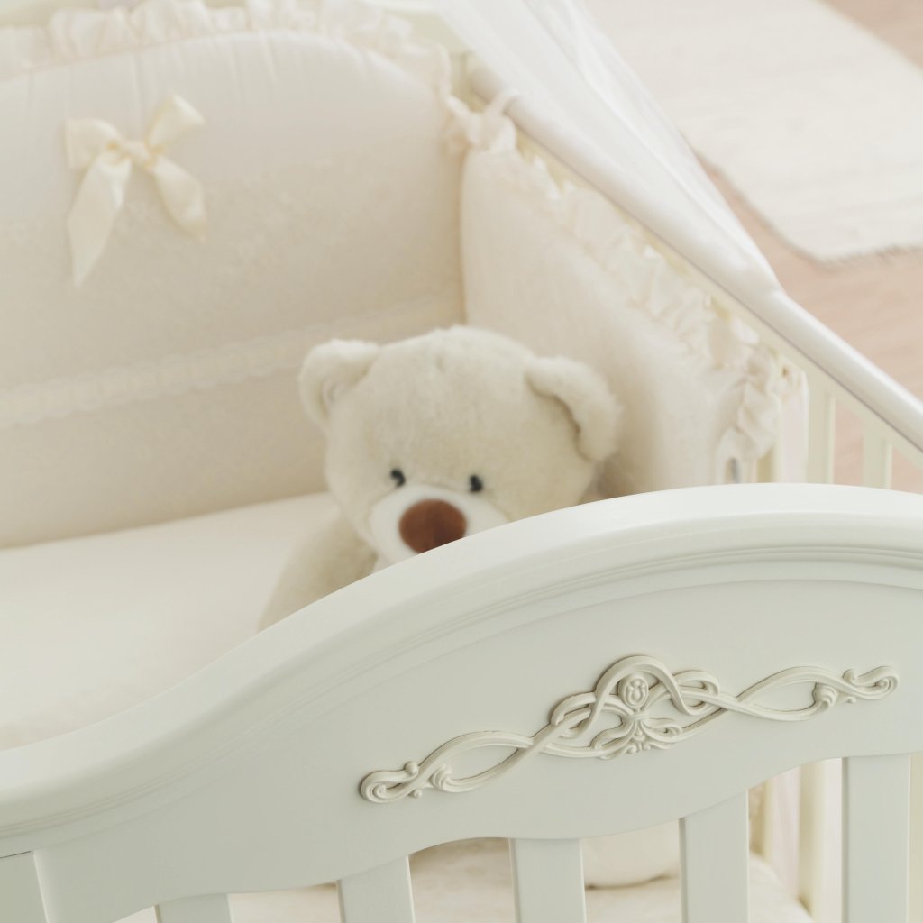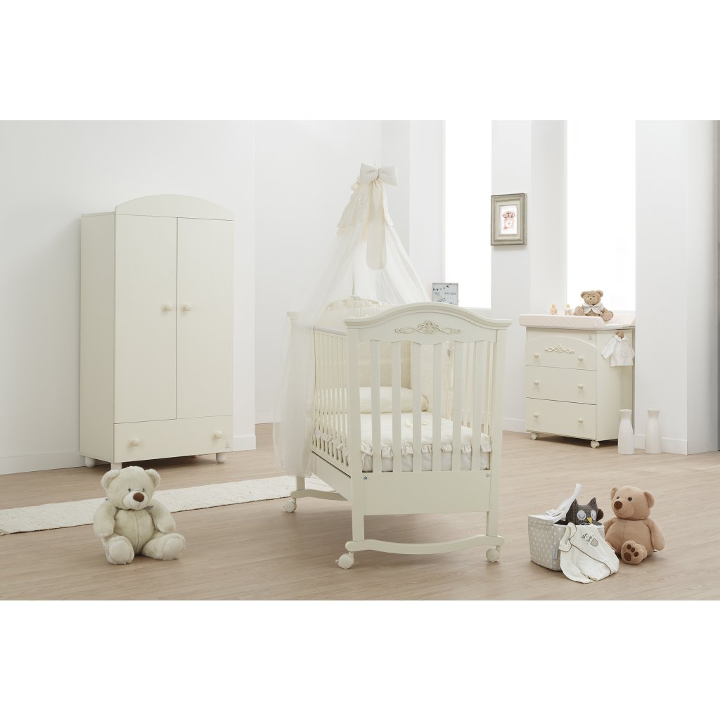 Romantická postieľka s kolieskami s odnímateľnou bočnicou. K postieľke je možné dokúpiť kompletnú kolekciu Classic ako komodu, skriňu a doplnky do detskej izbičky.