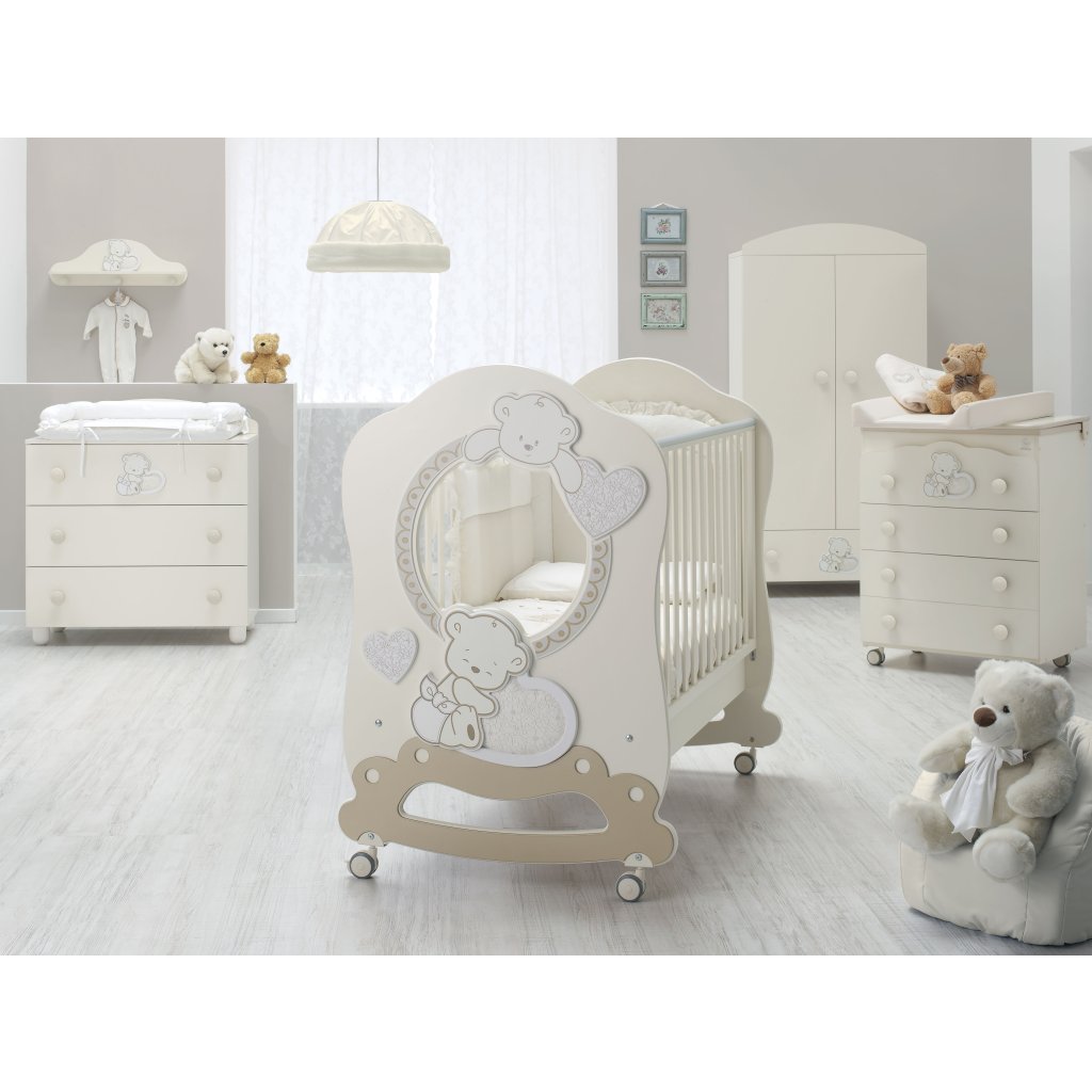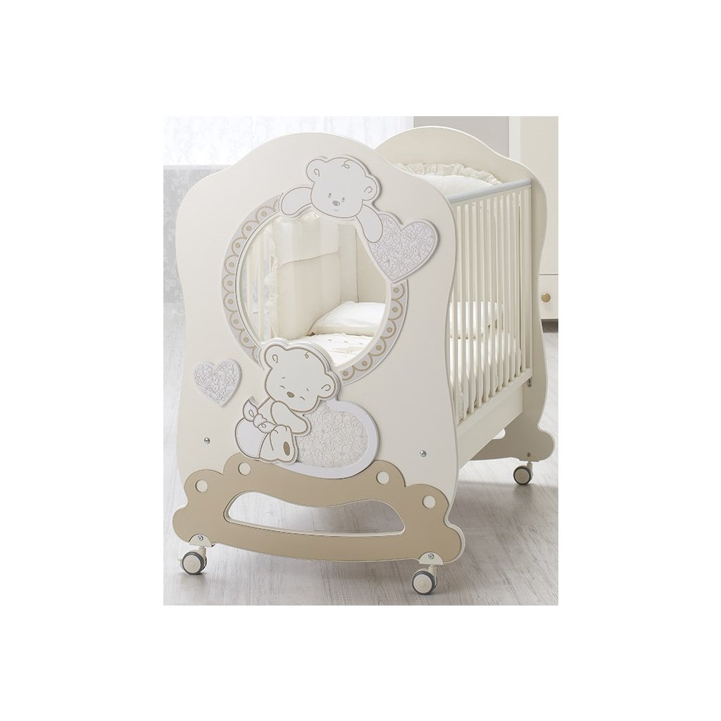 Talianska postieľka s posuvnými bočnicami. K postieľke je možné dokúpiť kompletnú kolekciu z izbičky Love ako komodu, skriňu a doplnky do detskej izbičky.