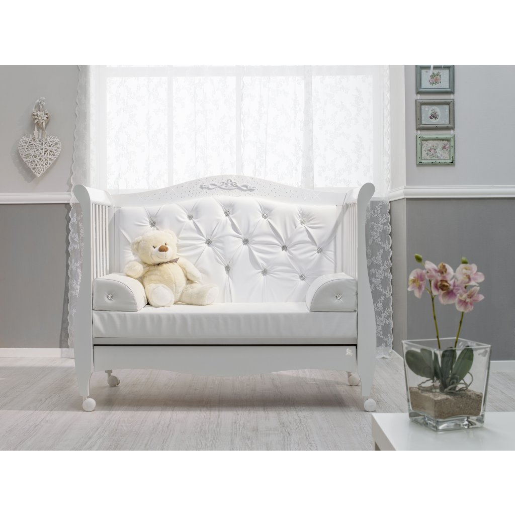 Romantická luxusná postieľka s kryštálykmi v bielej farbe s kolieskami. K postieľke je možné dokúpiť kompletnú kolekciu Manifique ako komodu, skriňu a doplnky do detskej izbičky.