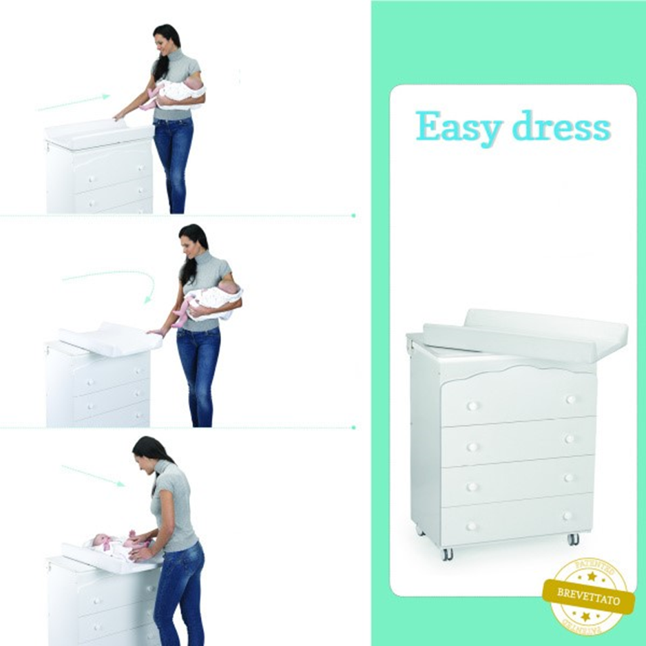 Spoločnosť Italbaby, ktorá vždy dbá na potreby mamičiek a na kvalitu svojich výrobkov predstavuje úplne nový revolučný výrobok, systém Easy Dress na prebaľovanie. Okrem známych vlastností detskej vaničky a prebaľovacieho pultu pridala spoločnosť Italbaby k tomuto produktu jedinečný patent na svete, o ktorom sa predpokladá, že matke uľahčí kúpanie, prebaľovanie a bezpečné a pohodlné obliekanie dieťaťa. Všetky výrobky, ktoré sú teraz na trhu núti matku, aby s dieťaťom na prebaľovacom pulte zaobchádzala "neprirodzene". Stáva sa to preto, že bezpečnejším a prirodzenejším spôsobom prebaľovania, starostlivosti a obliekania dieťaťa je umiestnenie dieťaťa "pred mamou", a nie stranou. Systém "Easy Dress" predstavuje riešenie tohto problému. Jednoduchým pohybom sa prebaľovacia časť otočí z vodorovnej polohy do kolmej polohy "priamo k matke". Toto umožňuje matke konať praktickejšie. Priestor, ktorý zaberá rotujúca plocha zodpovedá priestoru, ktorý zaberá detský pult, takže nevyžaduje ďalšie priestory po stranách. Voľný priestor môžete využiť na odloženie detskej kozmetiky, plienok a iných drobností nevyhnutných počas prebaľovania bábätka.