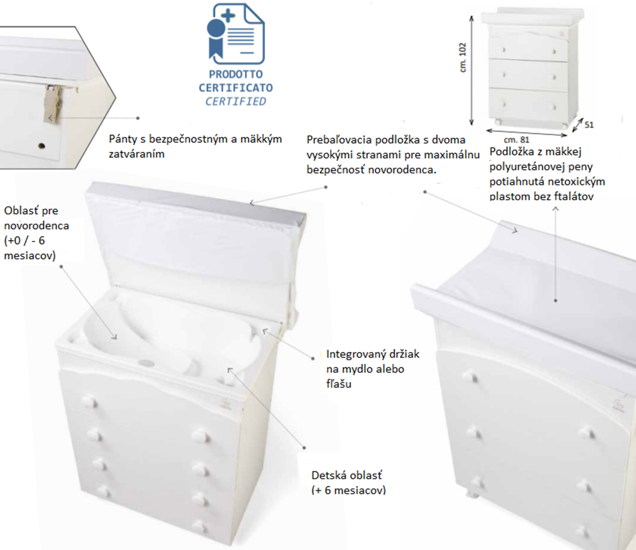 Pult je využiteľný dlhodobo, neskôr keď už pult nebudete využívať na prebaľovanie alebo kúpanie bábätka, podložku a vaničku môžete odložiť a prebaľovací pult ďalej používať ako praktickú detskú komodu. Pult je vybavený troma praktickými zásuvkami, ktoré sú na kovových koľajničkách s bezpečnostný zámkom.