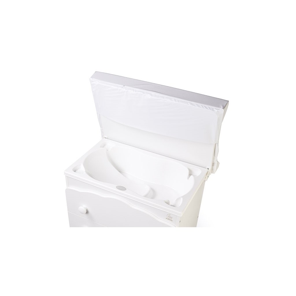 Nakoľko súčasťou pultu je praktická plastová vanička, môžete tento pult veľmi jednoducho využiť aj na kúpanie bábätka až do 12 mesiacov. Vanička je vyberateľná, preto môžete vaničku využívať aj samostatne alebo ako súčasť pultu. Vanička je ergonomicky a anatomicky tvarovaná s odkladacím priestorom na mydlo a sprchový gél. Jedna strana vaničky je určená pre novorodencov a opačná strana pre dieťa, ktoré už vie sedieť. Súčasťou je zátka, ktorou zamedzíte odtoku vody počas kúpania a plastová hadička, vďaka ktorej pohodlne vypustíte vodu z vaničky. Vanička je vyberateľná z pultu a po kúpeli viete vaničku jednoducho umyť a vysušiť.