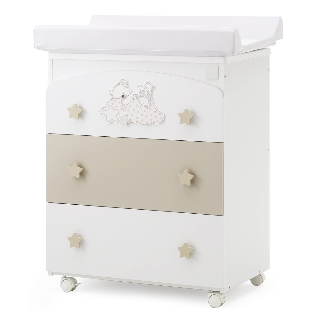 Multifunkčný prebaľovací pult značky Italbaby (3v1) sa používa buď na prebaľovanie bábätka a vďaka zabudovanej vaničke na kúpanie bábätka a neskôr ako praktická detská komoda. Má 3 zásuvky so systémom "push & pull", do ktorých vložíte potrebné veci Vášho bábätka.Zásuvky sú na kovových koľajničkách s bezpečnostný zámkom. účasťou balenia sú aj kolieska pre jednoduchú manipuláciu
