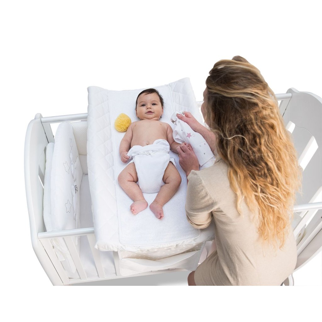 Prakticky riešená prebaľovacia podložka s mäkkým a umývateľným PVC. Vystužená detská prebaľovacia podložka navrhnutá pre starostlivosť o vaše dieťa, ktorá je veľmi praktická a stabilná s jednoduchým umiestnením na akúkoľvek postieľku.