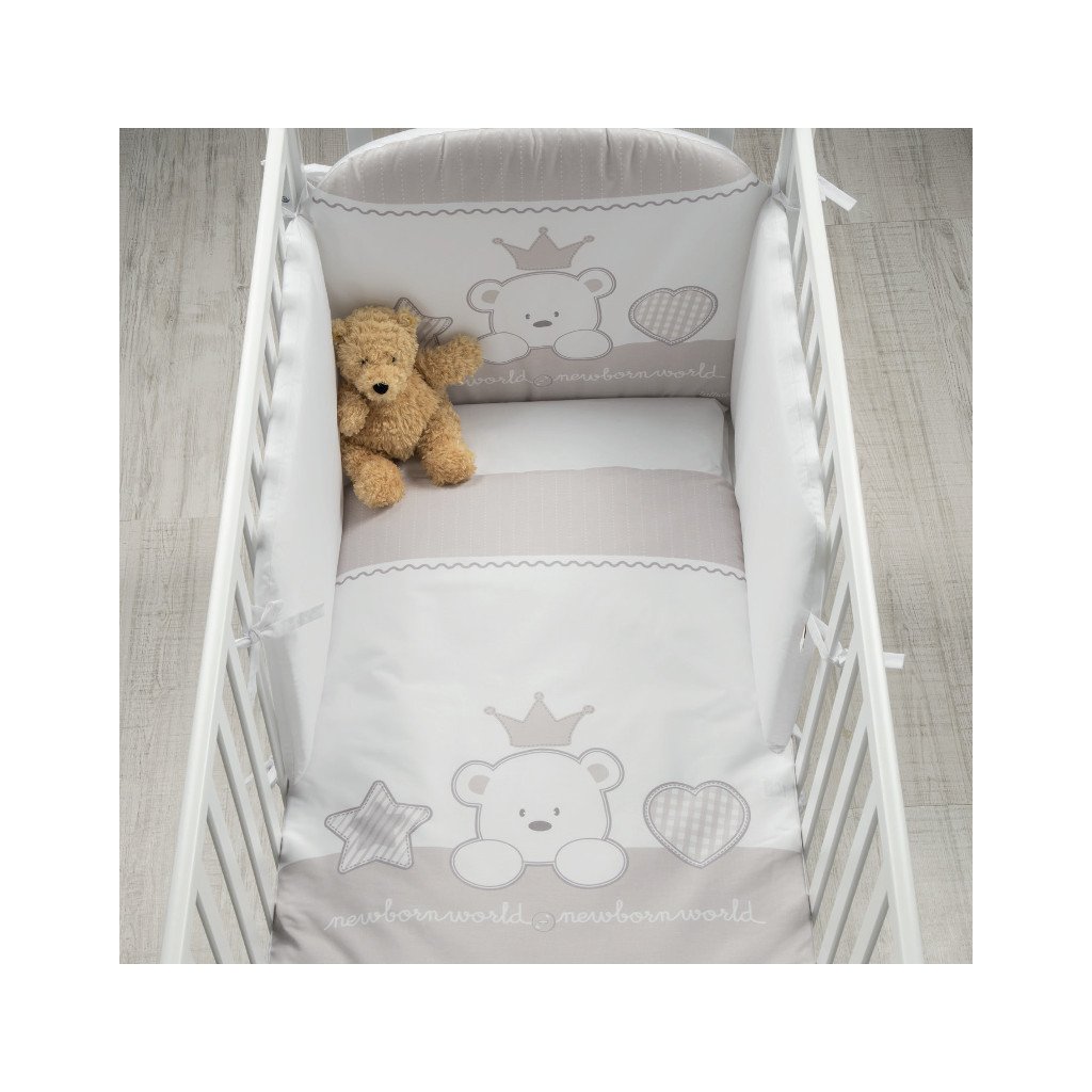 Kompletný 5 dielny set obsahuje: mantinel, paplónik + návliečku, plachtu na matrac a návliečku na vankúšik. 100% bavlna, vyrobené v Taliansku.