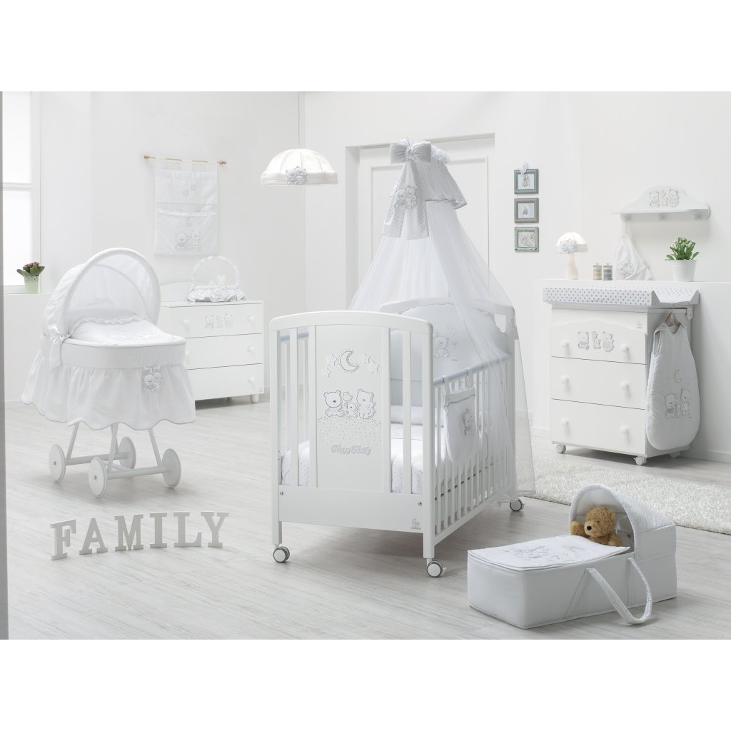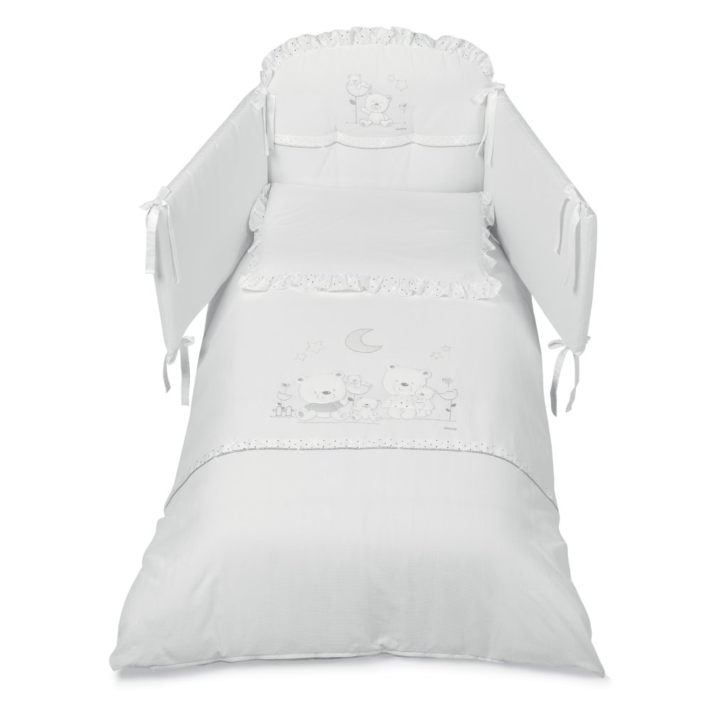 Kompletný 5 dielny set obsahuje: mantinel, paplónik + návliečku, plachtu na matrac a návliečku na vankúšik. 100% bavlna, vyrobené v Taliansku.
