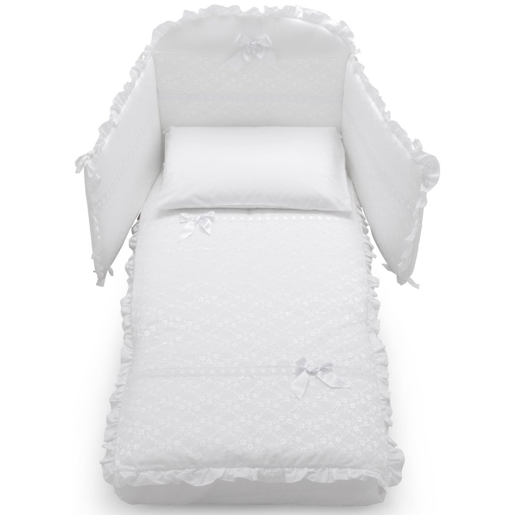 Kompletný 5 dielny set obsahuje: mantinel, paplónik + návliečku, plachtu na matrac a návliečku na vankúšik. 100% bavlna, vyrobené v Taliansku.