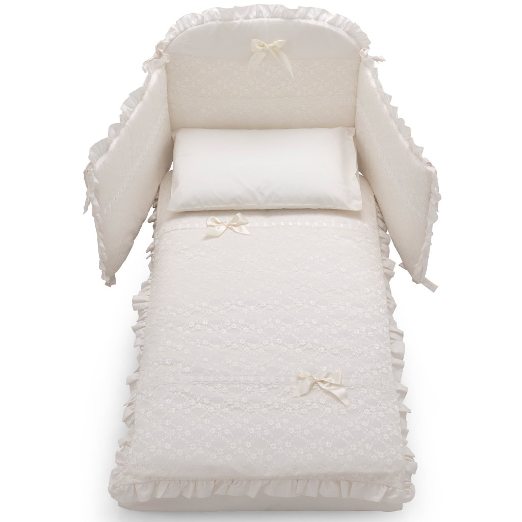 Kompletný 5 dielny set obsahuje: mantinel, paplónik + návliečku, plachtu na matrac a návliečku na vankúšik. 100% bavlna, vyrobené v Taliansku.