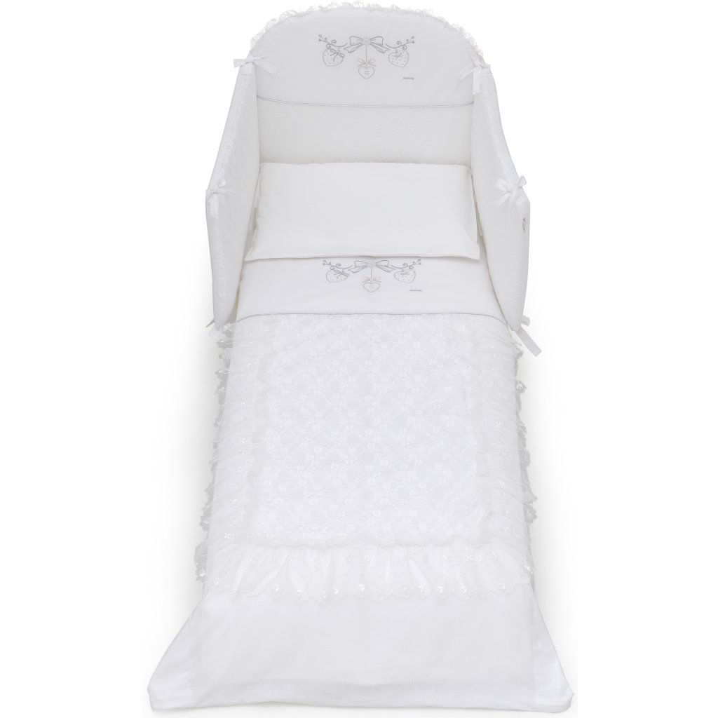 Kompletný 5 dielny set obsahuje: mantinel, paplónik + návliečku, plachtu na matrac a návliečku na vankúšik. 100% bavlna, vyrobené v Taliansku.