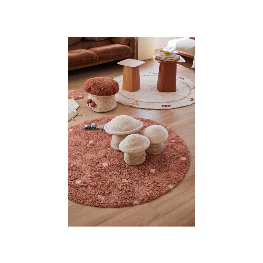 Ručne tkaný bavlnený detský koberec, ktorý môžete prať v domácej PRAČKE !!! Koberec je vyrábaný zo 100% prírodnej bavlny, použitá najvyššia kvalita bavlny a len prírodné farbivá. Ideálne pre Vaše deti, vhodné pre alergikov. Rozmer: priemer 140 cm. Farba koberca gaštanová hnedá - teplý odtieň hnedej s jemným červeným alebo oranžovým podtónom.