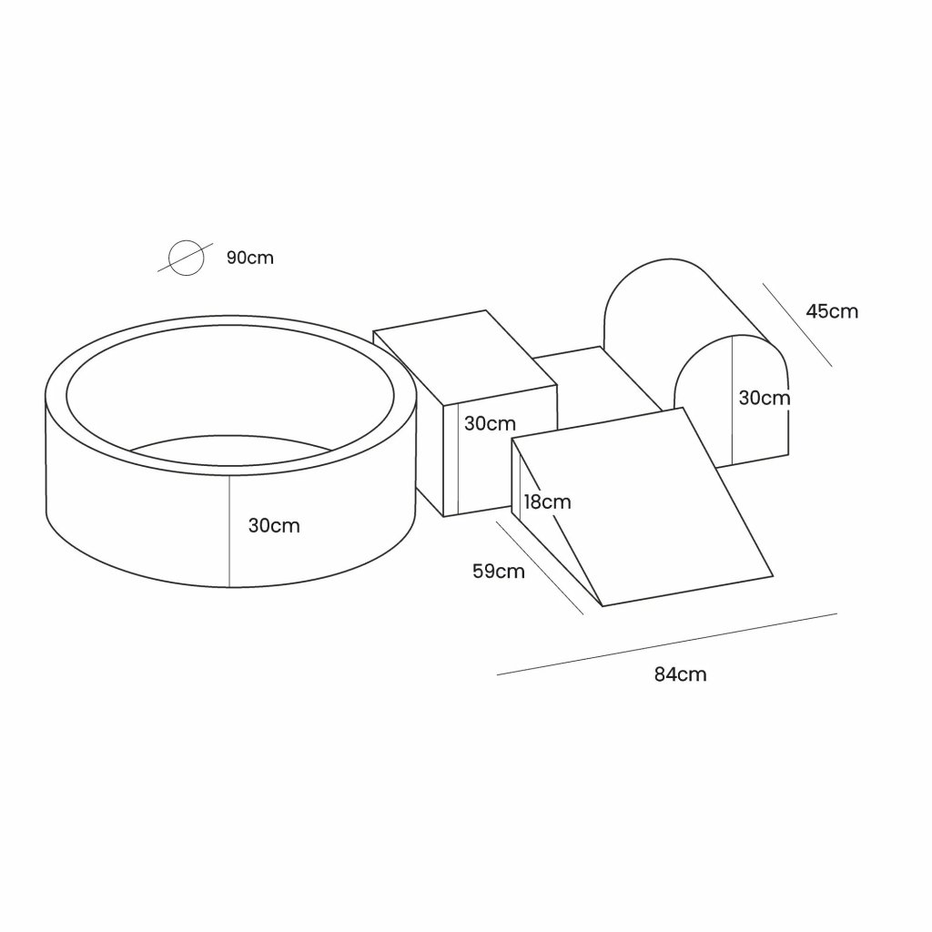 Zábava nepozná hranice! Teraz si môžete vytvoriť ihrisko vo svojom vlastnom dome! Hracie bloky nielen stimulujú detskú fantáziu, ale učia aj tvorivému mysleniu. 4 dielna sada modulov sa dá využiť na zábavu, ale aj na cvičenie, na vytváranie prekážkových dráh alebo priestorových štruktúr. Jednotlivé prvky možno použiť ako preliezačky alebo sedáky. Balenie obsahuje 200 loptičiek.