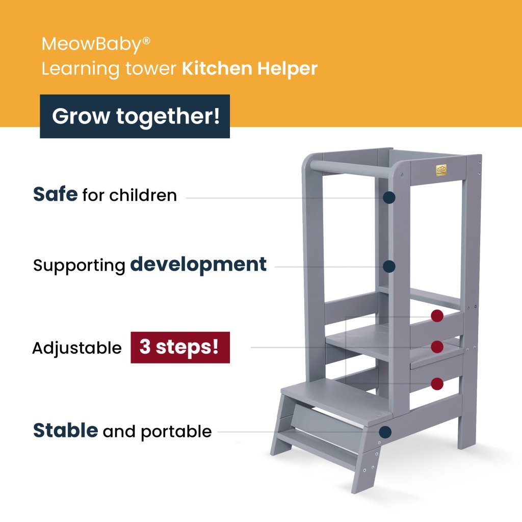 MeowBaby® montessori drevená učiaca veža pre deti - šedá