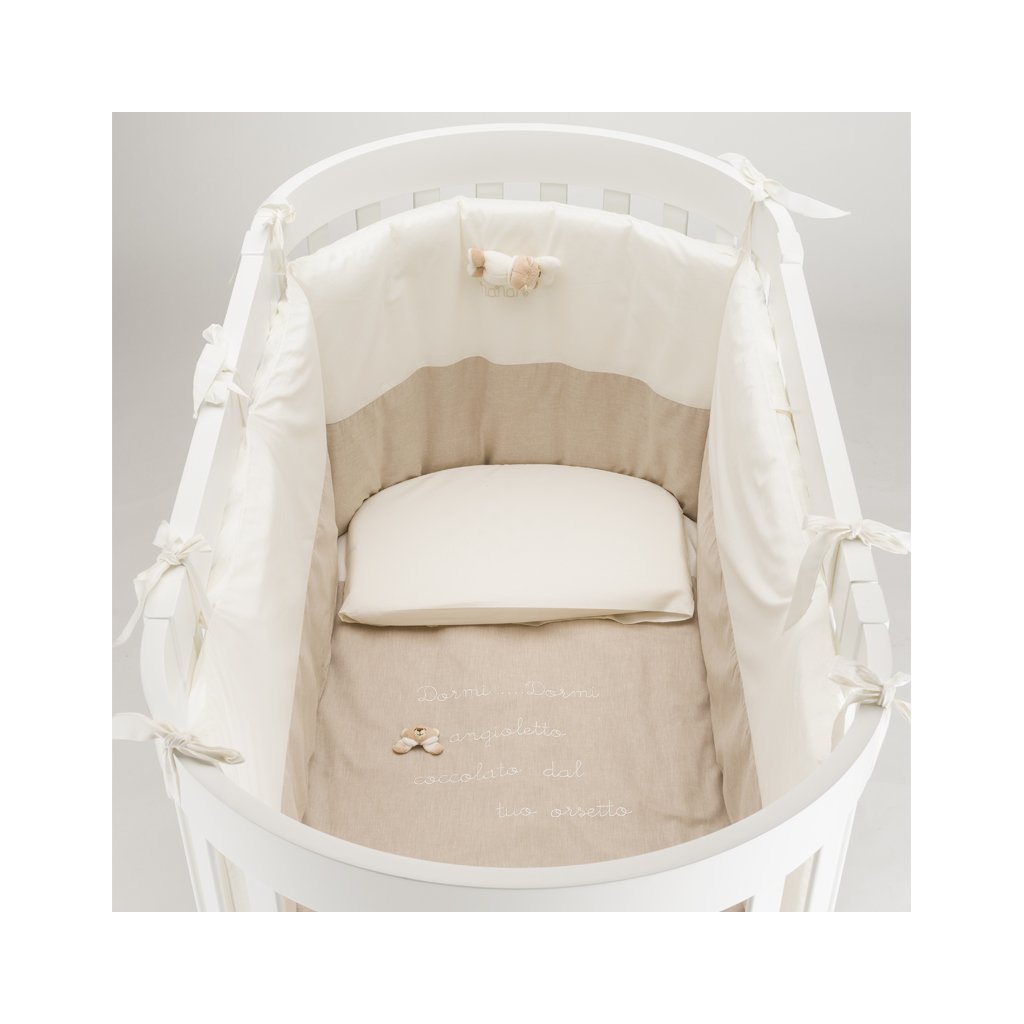 Doprajte svojmu bábätku maximálny komfort s elegantnou 4-dielnou súpravou Nanán Tato, ktorá je vhodná do oválnych postieľok. Neutrálna farba a prémiové materiály zaručia bezpečie a pohodlie počas spánku. Set obsahuje: ochranný mantinel, návliečku na vankúšik, návliečku na perinu a samotnú perinu. Vhodné do oválnej detskej postieľky s medvedíkom Tato v béžovej farbe.