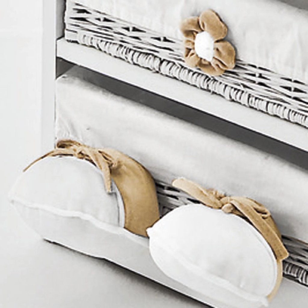 Komoda má štyri zásuvky z ručne tkaného prútia, ktoré sú prekryté 100% bavlnenou látkou. Na zásuvkách sú vyšívané kvetinky. Túto komodu si vaše deti zamilujú, keďže na vrchu komody je hlava medvedíka a na spodnom koši má chodidlá. Medvedík Tato je neustále nablízko a robí tak dieťaťu neustále spoločnosť.