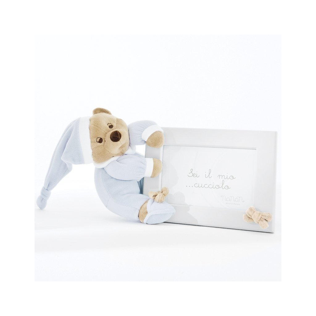 Uchovajte si najvzácnejšie spomienky na vaše bábätko v nádhernom fotorámiku Nanán s plyšovým medvedíkom Puccio v bledomodrej farbe. Tento luxusný doplnok s plyšovým medvedíkom je dokonalým darčekom pre novorodenca a zároveň štýlovou dekoráciou do detskej izby. 💕