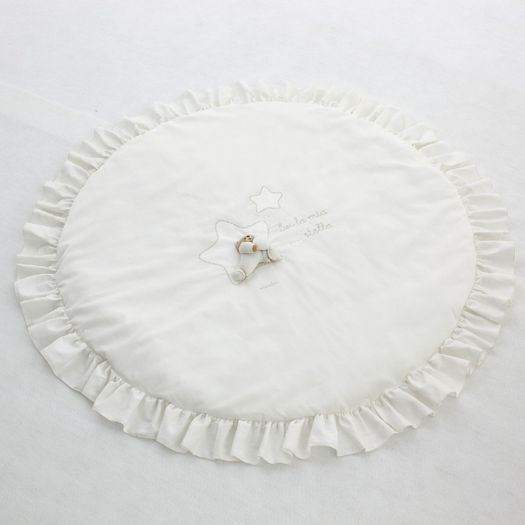 Pohodlné a štýlové miesto na hranie pre vaše bábätko! 🧸🤍 Hracia podložka s volánikmi Nanán – Macko Tato v nežnej smotanovej farbe poskytuje mäkký a bezpečný priestor na hranie aj odpočinok. Luxusný dizajn s jemnými volánikmi dodáva izbičke elegantný vzhľad. 🎠✨ Priemer 100cm.