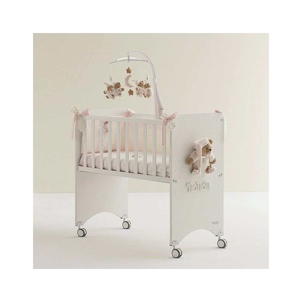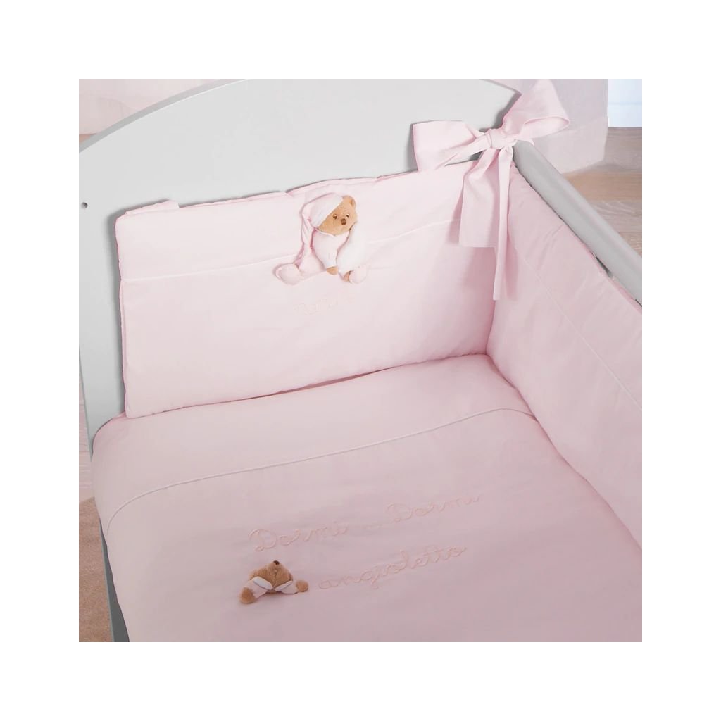 Roztomilý set prádla s mantinelom do detskej postieľky zdobený výšivkami sladkého medvedíka Pucio v ružovej farbe. Tento set je vhodný pre Nanán mini postieľku s matracom Puccio ružová.