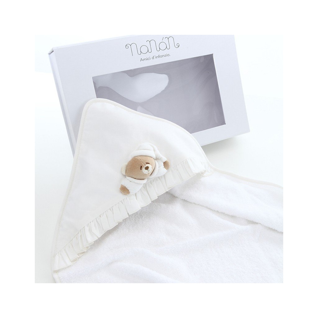 Bavlnená froté osuška pre novorodenca s kapucňou a žinkou v darčekovej krabičke. Vyrobené zo 100% certifikovanej bavlny v Taliansku. Ideálne ako darček.
