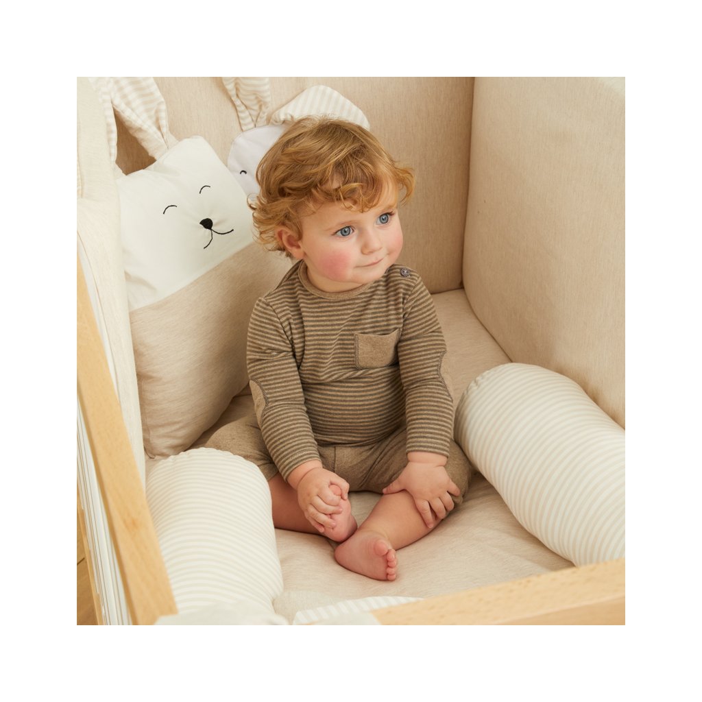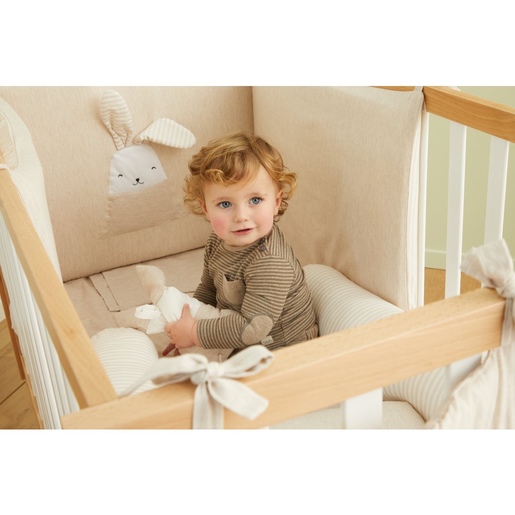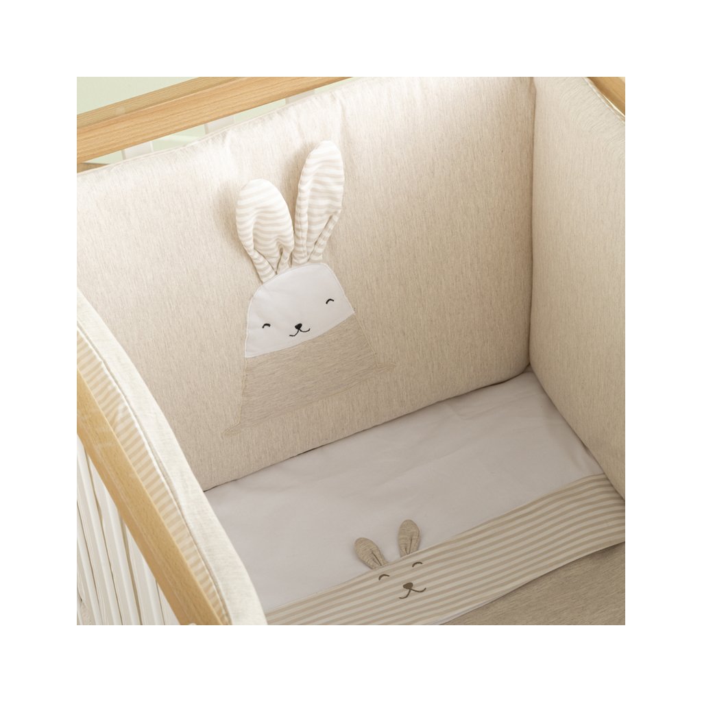 Roztomilý 4-dielny set prádla s mašličkami do detskej postieľky z kolekcie Bunny v béžovej farbe. Set obsahuje: ochranný mantinel, návliečku na vankúšik, návliečku na perinu a samotnú perinu.