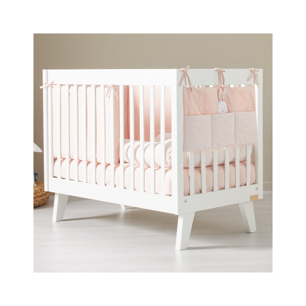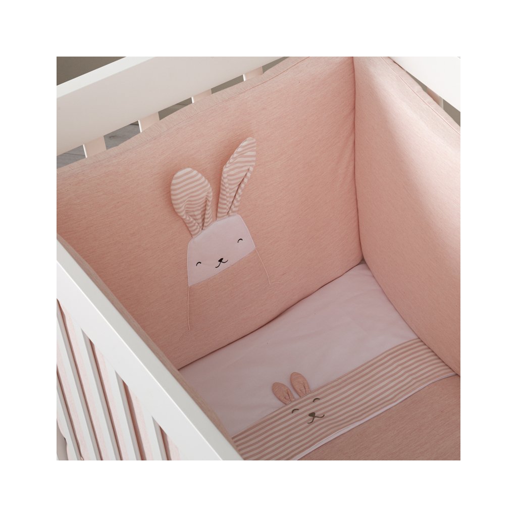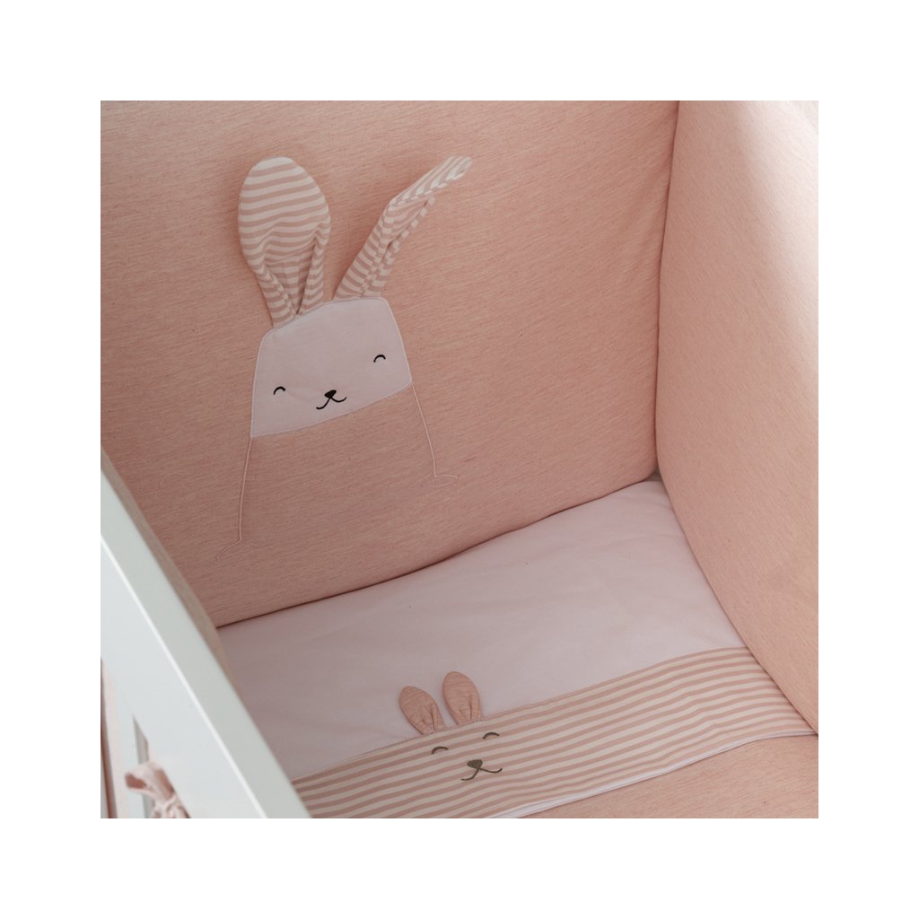 Roztomilý 4-dielny set prádla s mašličkami do detskej postieľky z kolekcie Bunny v bledoružovej farbe. Set obsahuje: ochranný mantinel, návliečku na vankúšik, návliečku na perinu a samotnú perinu.