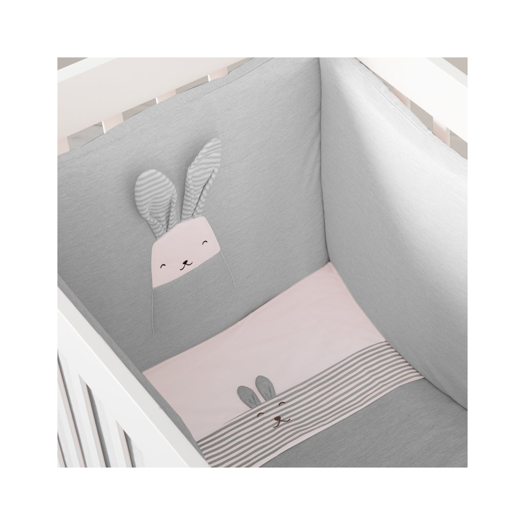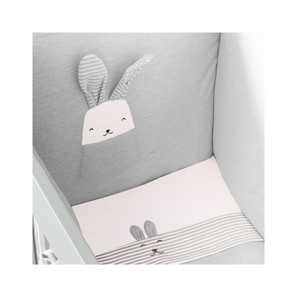 Roztomilý 4-dielny set prádla s mašličkami do detskej postieľky z kolekcie Bunny v šedej farbe. Set obsahuje: ochranný mantinel, návliečku na vankúšik, návliečku na perinu a samotnú perinu.