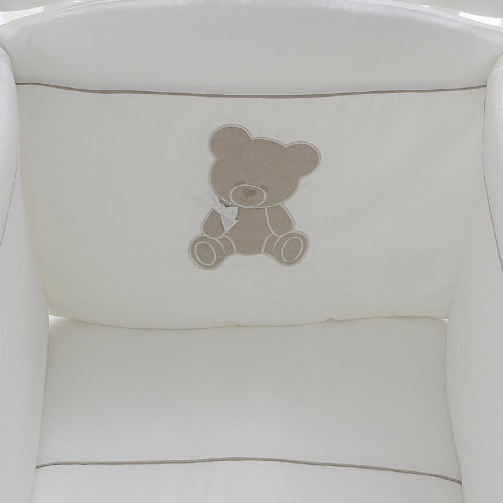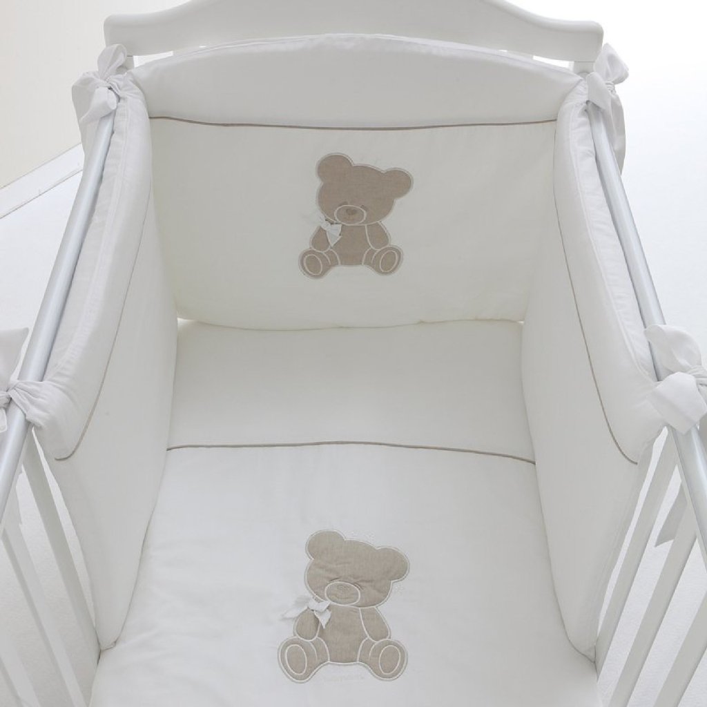 Roztomilý set prádla s mantinelom do detskej postieľky zdobený výšivkami sladkého medvedíka v bielej farbe. Tento kompletný set obsahuje všetko čo potrebujete pre detskú postieľku - ochranný mantinel s mašličkami, obliečku na vankúšik, obliečku na perinu a samotnú perinu. (Neobsahuje vankúšik).