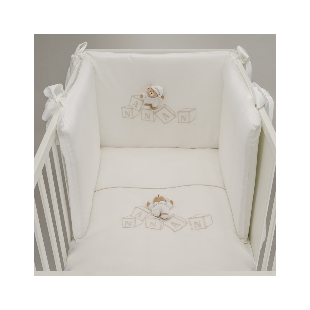 Roztomilý set prádla s mantinelom do detskej postieľky zdobený výšivkami sladkého medvedíka Tato v béžovej farbe. Tento kompletný set obsahuje všetko čo potrebujete pre detskú postieľku - ochranný mantinel s mašličkami, obliečku na vankúšik, obliečku na perinu a samotnú perinu. (Neobsahuje vankúšik).