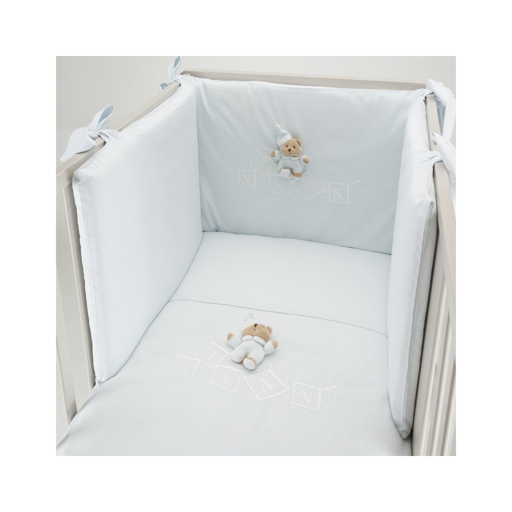 Roztomilý set prádla s mantinelom do detskej postieľky zdobený výšivkami sladkého medvedíka Puccio v bledomodrej farbe. Tento kompletný set obsahuje všetko čo potrebujete pre detskú postieľku - ochranný mantinel s mašličkami, obliečku na vankúšik, obliečku na perinu a samotnú perinu. (Neobsahuje vankúšik).