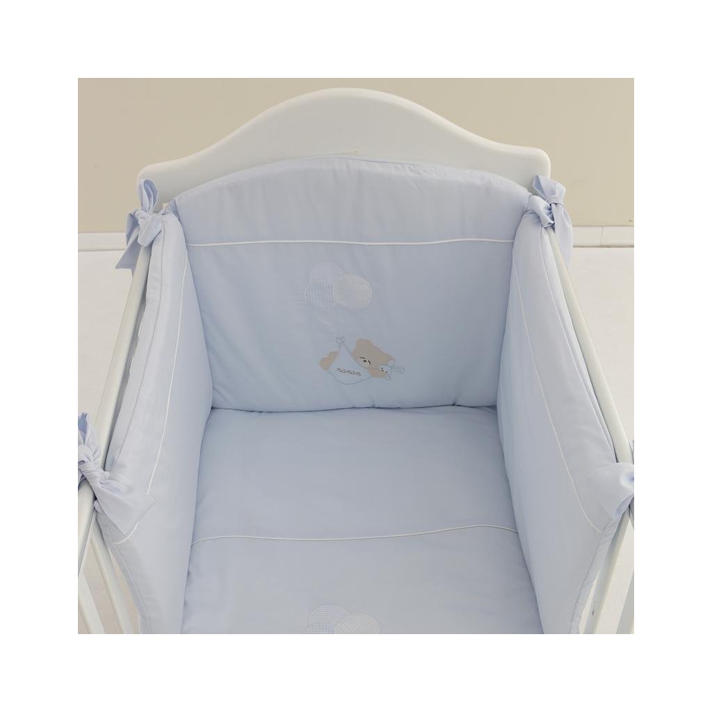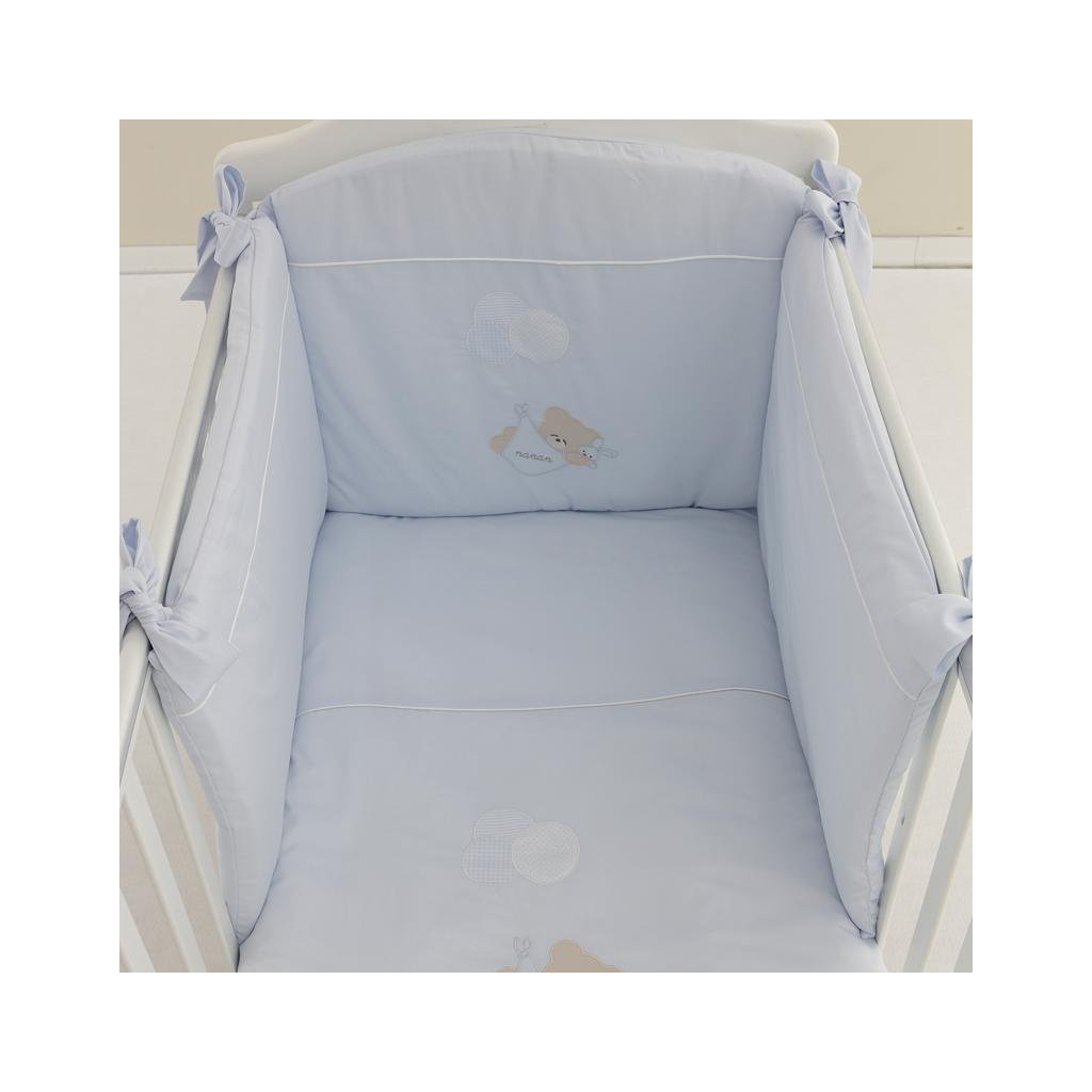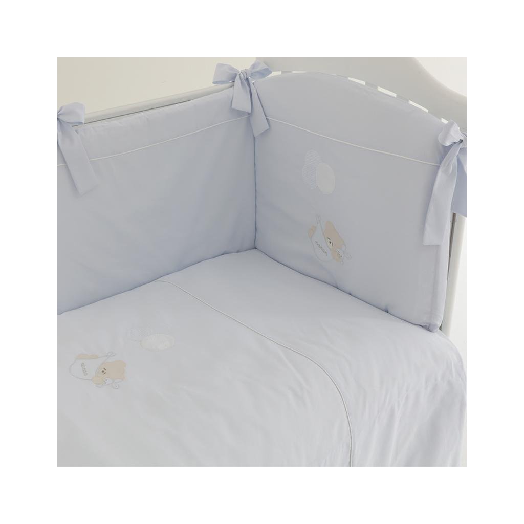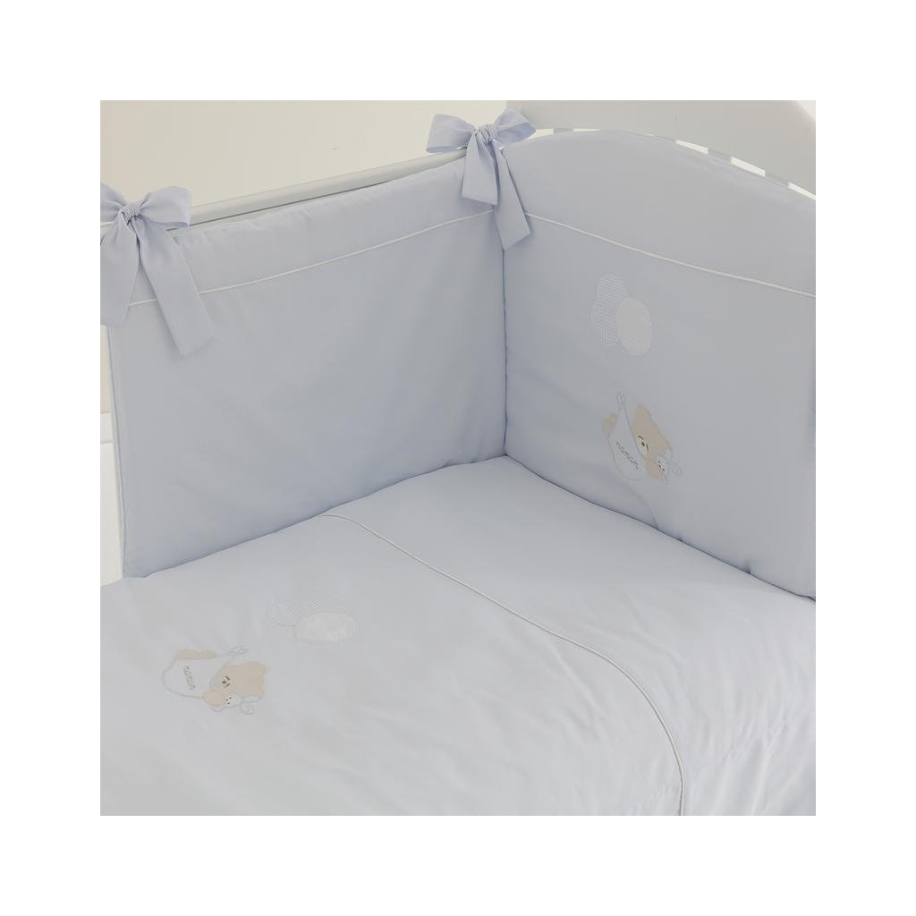 Roztomilý 4-dielny set prádla s mašličkami do detskej postieľky s medvedíkom v bledomodej farbe. Set obsahuje: ochranný mantinel, návliečku na vankúšik, návliečku na perinu a samotnú perinu.
