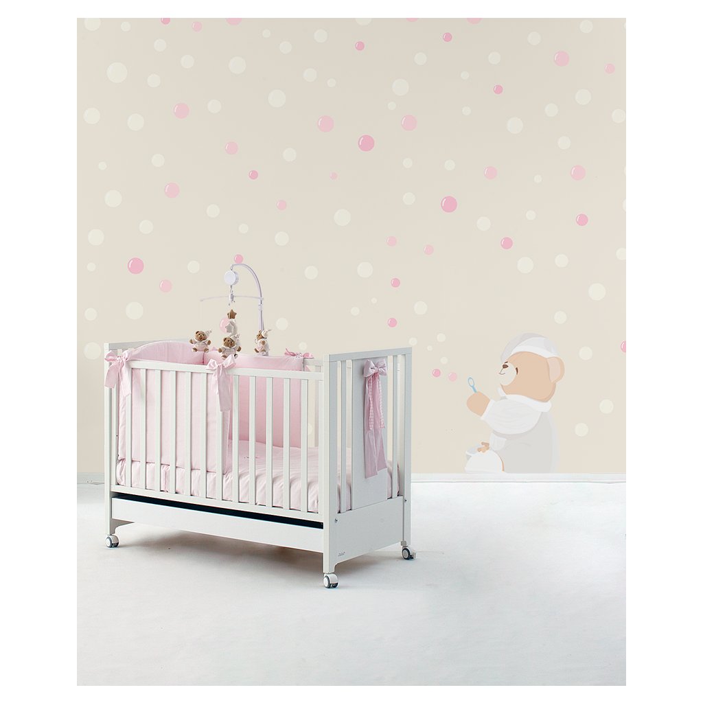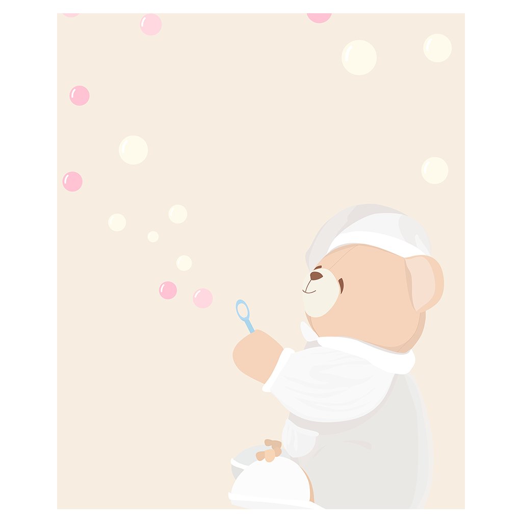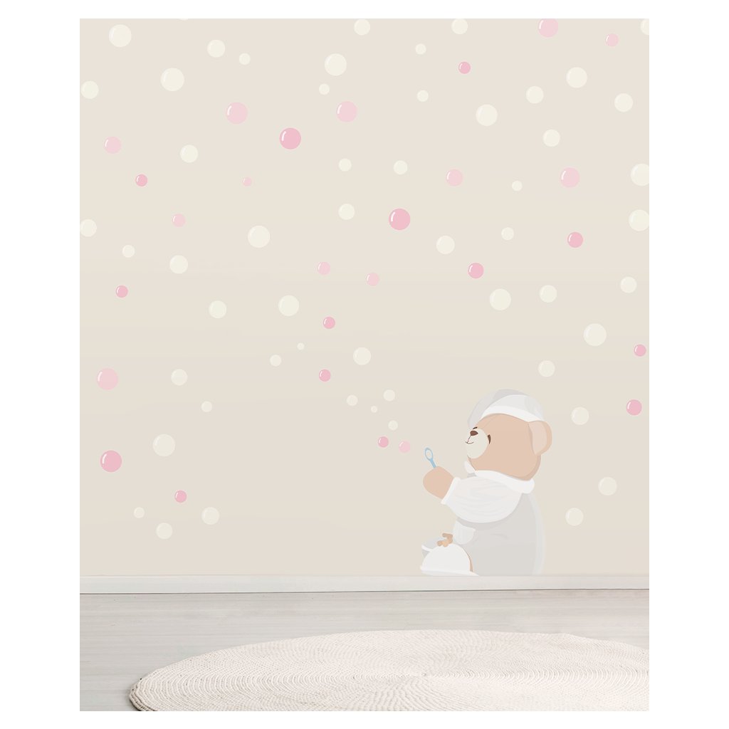 Nanán tapeta Bubbles je personalizovaná tapeta na mieru s medvedíkom Tato, ktorý sa hrá s bublinkami.
