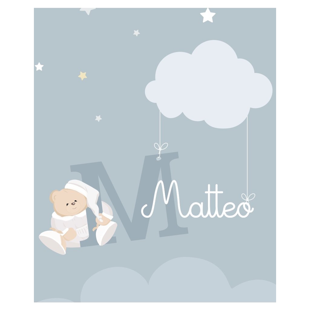 Personalizovaná tapeta na mieru s medvedíkom Tato, ktorý drží stužku s menom dieťatka, s ktorým bude zdieľať izbu. Dostupná vo farbách: béžová, modrá a ružová.