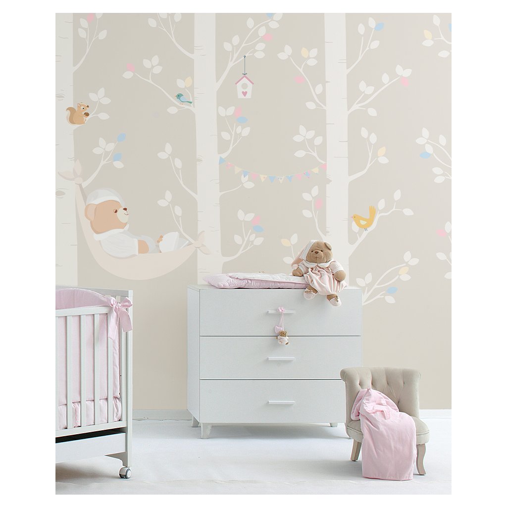 Roztomilá Nanán tapeta na mieru s medvedíkom Tato, ktorá pozýva na odpočinok v Nanán štýle. S touto tapetou sa detská izbička príjemná a relaxačná.