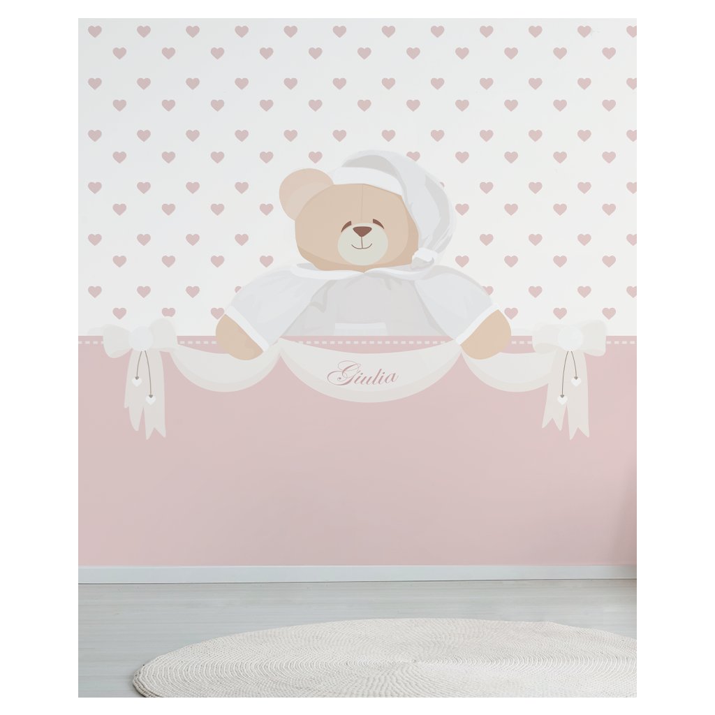 Personalizovaná tapeta na mieru s medvedíkom Tato, ktorý drží stužku s menom dieťatka, s ktorým bude zdieľať izbu. Dostupná vo farbách: béžová, modrá a ružová.