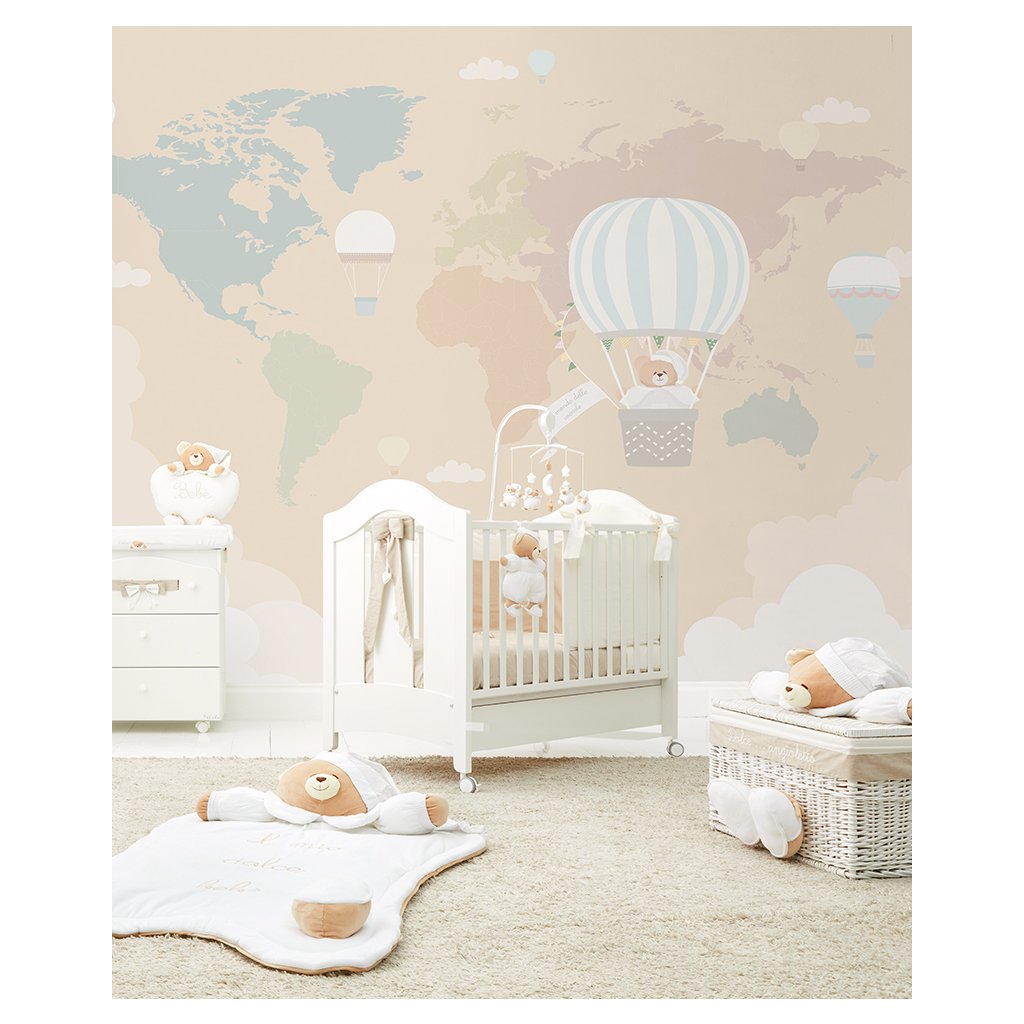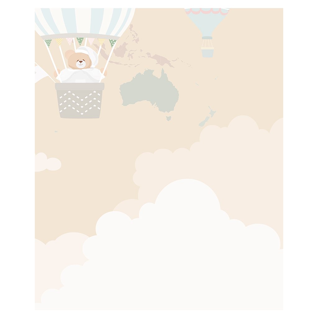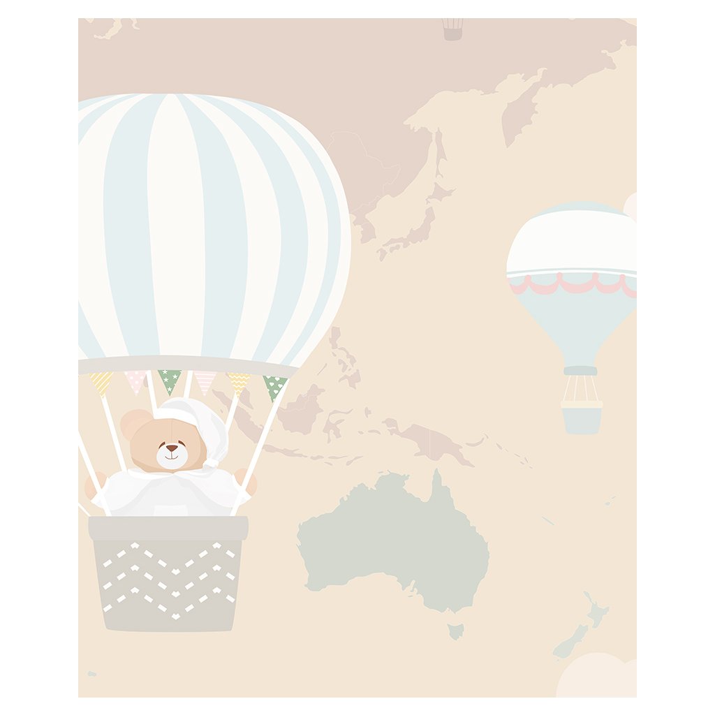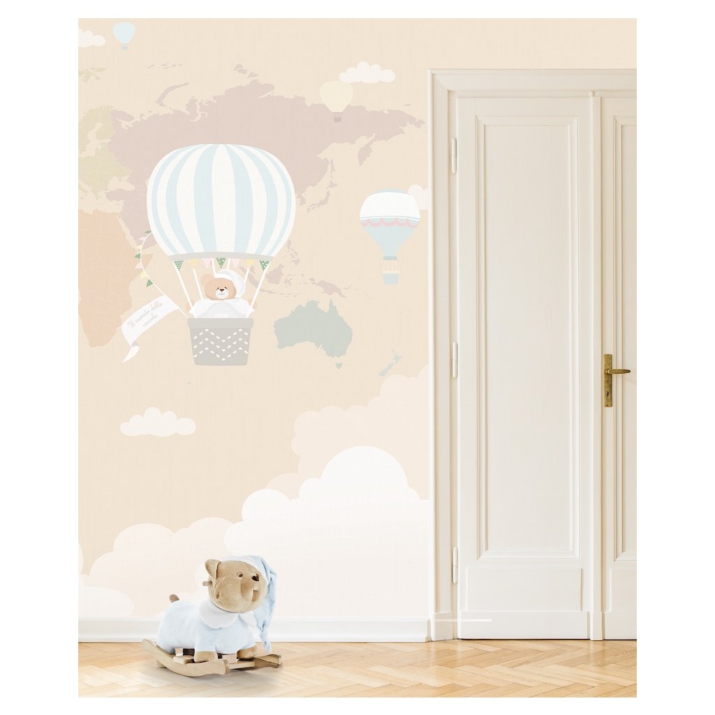 Nanán tapeta na mieru s medvedíkom Tato, ktorý letí v balóne v oblakoch. Tapeta má jemné a teplé farby ideálne do detských izbičiek.