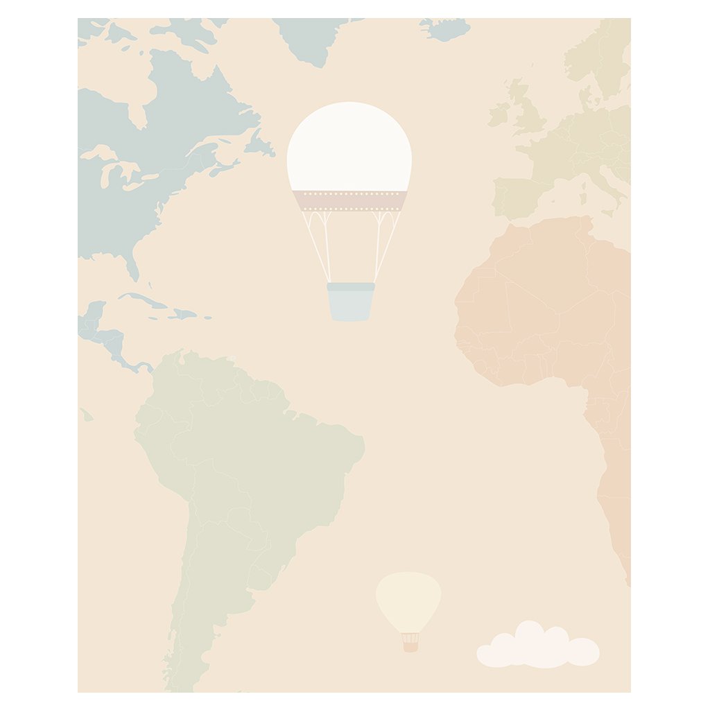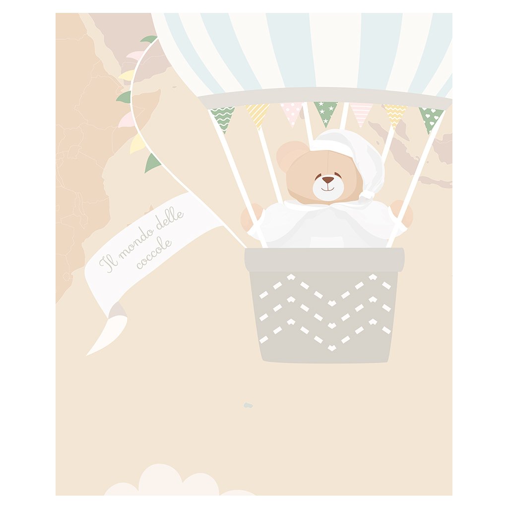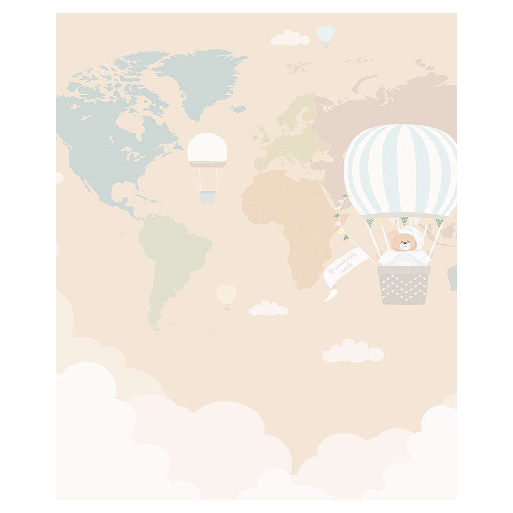 Tapeta Tato v balóne hovorí o ceste sladkého medveďa Tato, ktorý letí v balóne. Sen všetkých dospelých a detí: výlet v horkovzdušnom balóne. Jemné a teplé farby ideálne do spální chlapcov a dievčat. Sladká a relaxačná téma, ktorá rozpráva o celom svete Nanán.