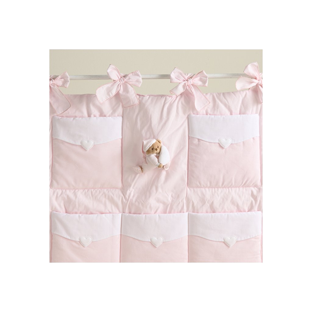 Udržujte detskú izbičku upratanú a elegantnú s Nanán závesným odkladačom s mašličkami z kolekcie Puccio v ružovej farbe. Tento prešívaný organizér je vybavený piatimi praktickými vreckami, ideálnymi na uloženie plienok, hračiek či oblečenia vášho bábätka. Jemné mašličky a dizajn s medvedíkom Puccio dodávajú odkladaču rozkošný vzhľad, ktorý skrášli každú detskú izbu.