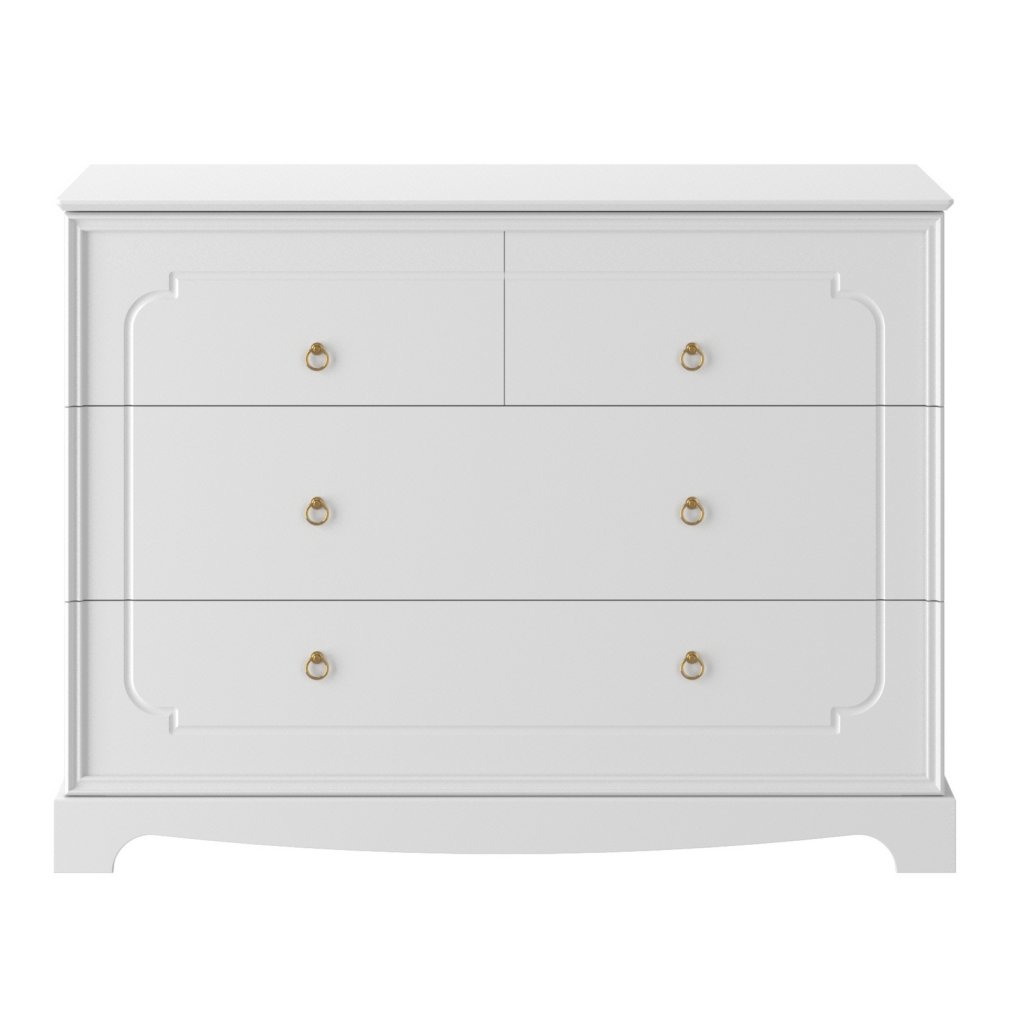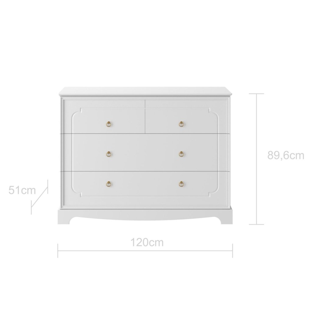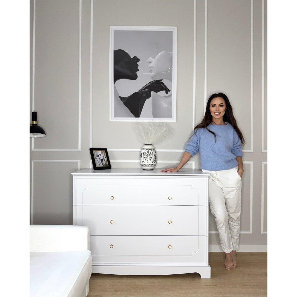 Kráľovský poriadok a dokonalý štýl v jednom – komoda Noble so 4 zásuvkami je ideálna voľba pre rodičov, ktorí chcú spojiť krásu a praktickosť. Jej rafinovaný dizajn v bielej matnej farbe zapadne do každej detskej izby s noblesou.