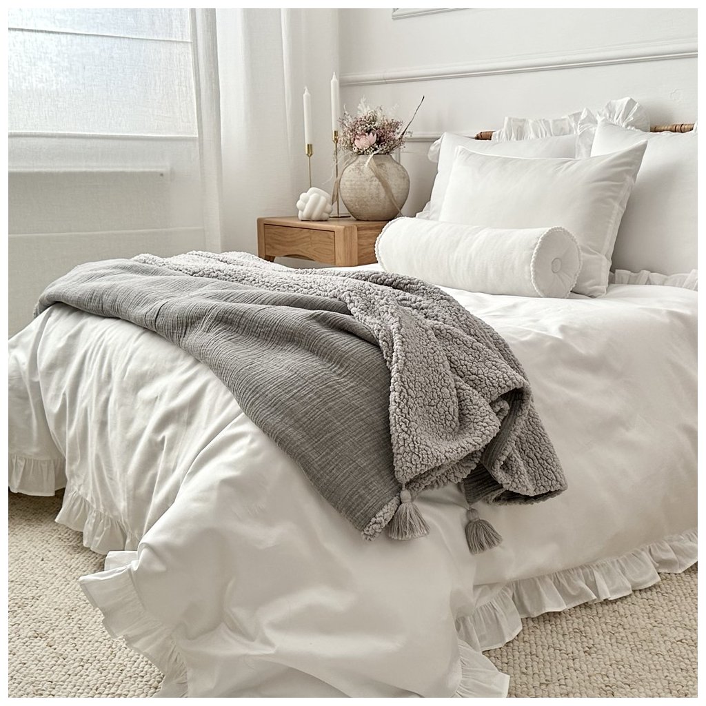 Obojstranná mušelínová deka - prehoz sivá je útulným doplnkom interiéru, ale aj hrejivou pokrývkou na chladnejšie večery.
