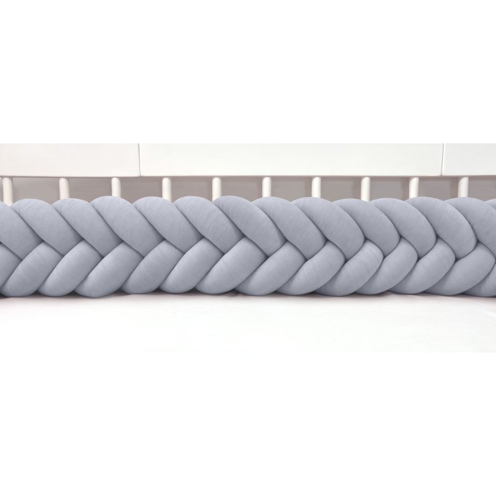 Plyšový ochranný zapletaný mantinel - pletenec päťkový slúži ako ochranca vášho dieťatka v postieľke a zároveň ako štýlový doplnok v detskej izbe. Pletenec má sadu ozdobných stúh na pripevnenie. Výška cca 22 cm, hrúbka cca 10 cm. Mantinel je dostupný v rôznych dĺžkach (od 120 cm do 400 cm). Všetky pramene sú vyrobené z kvalitného Prémium bavlneného velúru (certifikát Oeko Tex Standard 100) a ručne spletené do vrkoča. Záruka najvyššej kvality – 100% Handmade. Farba: šedá, číslo vo vzorkovníku: 18.