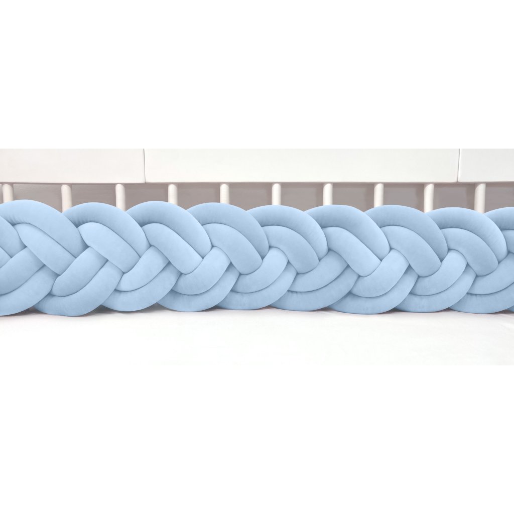 Plyšový ochranný zapletaný mantinel - pletenec šesťkový slúži ako ochranca vášho dieťatka v postieľke a zároveň ako štýlový doplnok v detskej izbe. Pletenec má sadu ozdobných stúh na pripevnenie. Výška cca 30 cm, hrúbka cca 10 cm. Mantinel je dostupný v rôznych dĺžkach (od 120 cm do 400 cm). Všetky pramene sú vyrobené z kvalitného Prémium bavlneného velúru (certifikát Oeko Tex Standard 100) a ručne spletené do vrkoča. Záruka najvyššej kvality – 100% Handmade. Farba: bledomodrá, číslo vo vzorkovníku: 13.
