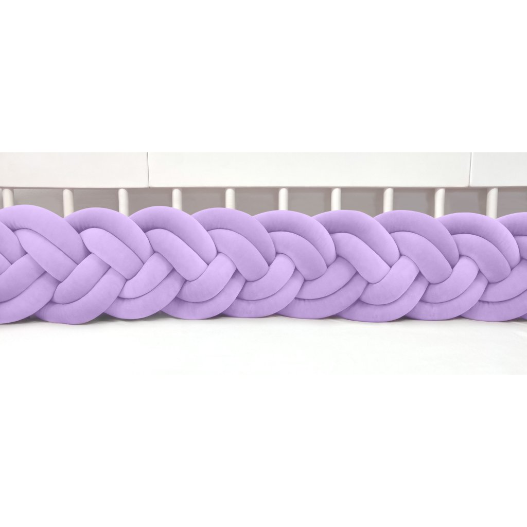 Plyšový ochranný zapletaný mantinel - pletenec šesťkový slúži ako ochranca vášho dieťatka v postieľke a zároveň ako štýlový doplnok v detskej izbe. Pletenec má sadu ozdobných stúh na pripevnenie. Výška cca 30 cm, hrúbka cca 10 cm. Mantinel je dostupný v rôznych dĺžkach (od 120 cm do 400 cm). Všetky pramene sú vyrobené z kvalitného Prémium bavlneného velúru (certifikát Oeko Tex Standard 100) a ručne spletené do vrkoča. Záruka najvyššej kvality – 100% Handmade. Farba: levandula, číslo vo vzorkovníku: 22.
