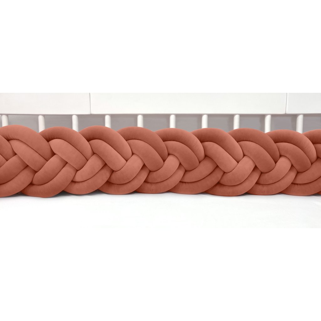 Plyšový ochranný zapletaný mantinel - pletenec šesťkový slúži ako ochranca vášho dieťatka v postieľke a zároveň ako štýlový doplnok v detskej izbe. Pletenec má sadu ozdobných stúh na pripevnenie. Výška cca 30 cm, hrúbka cca 10 cm. Mantinel je dostupný v rôznych dĺžkach (od 120 cm do 400 cm). Všetky pramene sú vyrobené z kvalitného Prémium bavlneného velúru (certifikát Oeko Tex Standard 100) a ručne spletené do vrkoča. Záruka najvyššej kvality – 100% Handmade. Farba: tehlová, číslo vo vzorkovníku: 26.