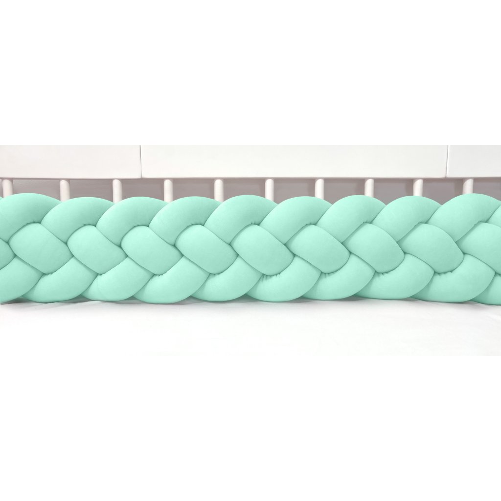 Plyšový ochranný zapletaný mantinel - pletenec štvoritý slúži ako ochranca vášho dieťatka v postieľke a zároveň ako štýlový doplnok v detskej izbe. Pletenec má sadu ozdobných stúh na pripevnenie. Výška cca 20 cm, hrúbka cca 9 cm. Mantinel je dostupný v rôznych dĺžkach (od 120 cm do 400 cm). Všetky 4 pramene sú vyrobené z kvalitného Prémium bavlneného velúru (certifikát Oeko Tex Standard 100) a ručne spletené do vrkoča. Záruka najvyššej kvality – 100% Handmade. Farba: bledo mäta, číslo vo vzorkovníku: 12.