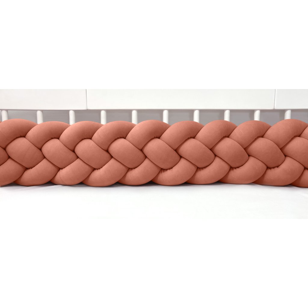 Plyšový ochranný zapletaný mantinel - pletenec štvoritý slúži ako ochranca vášho dieťatka v postieľke a zároveň ako štýlový doplnok v detskej izbe. Pletenec má sadu ozdobných stúh na pripevnenie. Výška cca 20 cm, hrúbka cca 9 cm. Mantinel je dostupný v rôznych dĺžkach (od 120 cm do 400 cm). Všetky 4 pramene sú vyrobené z kvalitného Prémium bavlneného velúru (certifikát Oeko Tex Standard 100) a ručne spletené do vrkoča. Záruka najvyššej kvality – 100% Handmade. Farba: tehlová, číslo vo vzorkovníku: 26.