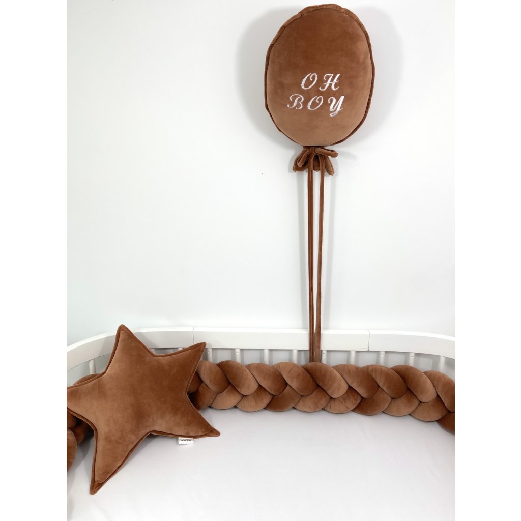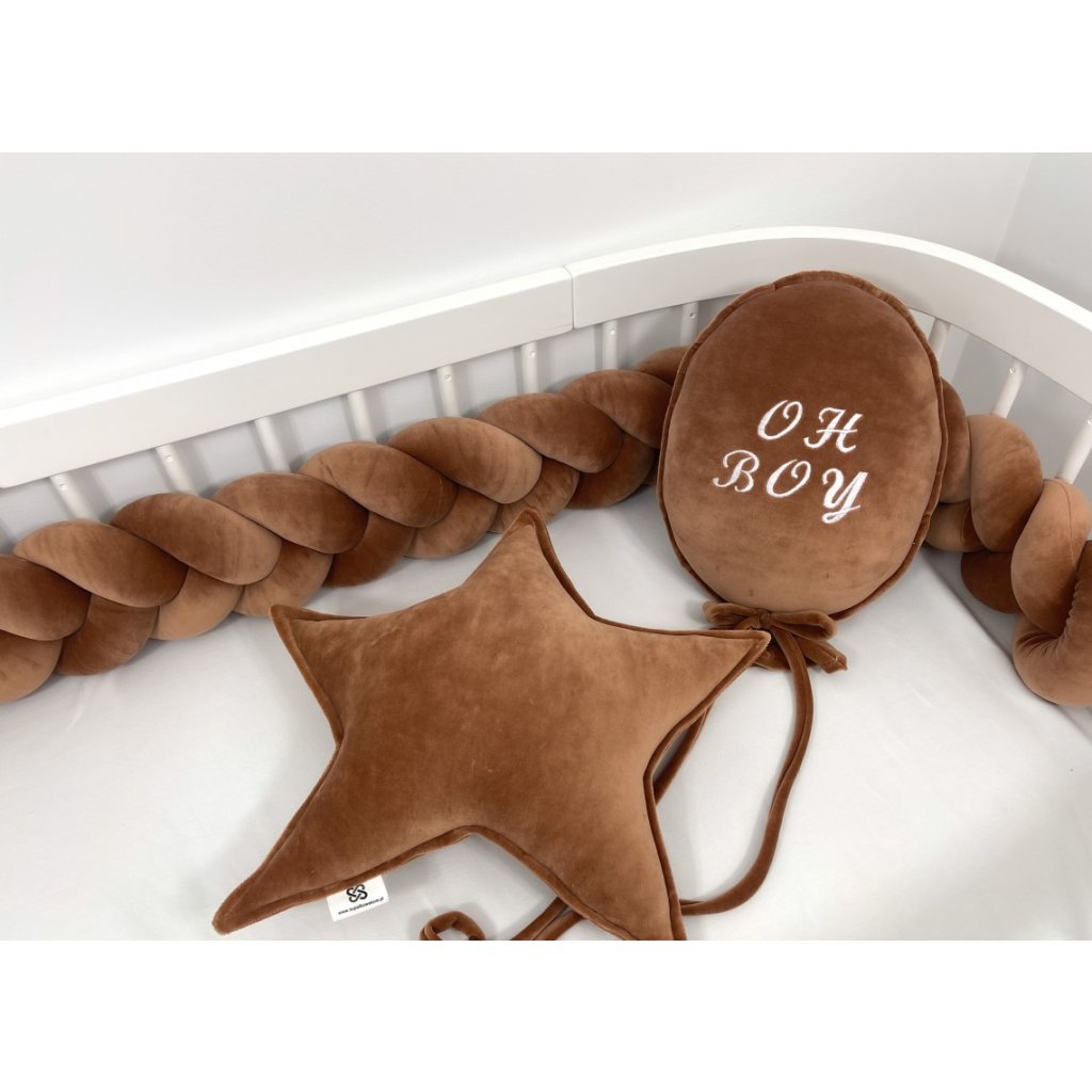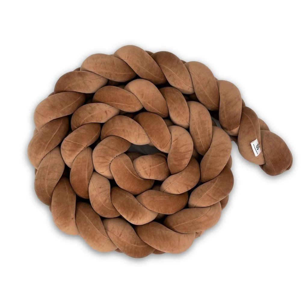 Plyšový ochranný zapletaný mantinel - pletenec trojitý slúži ako ochranca vášho dieťatka v postieľke a zároveň ako štýlový doplnok v detskej izbe. Pletenec má sadu ozdobných stúh na pripevnenie. Výška cca 15 cm, hrúbka cca 6 cm. Mantinel je dostupný v rôznych dĺžkach (od 120 cm do 400 cm). Všetky 3 pramene sú vyrobené z kvalitného Prémium bavlneného velúru (certifikát Oeko Tex Standard 100) a ručne spletené do vrkoča. Záruka najvyššej kvality – 100% Handmade. Farba: čokoládová, číslo vo vzorkovníku: 24.