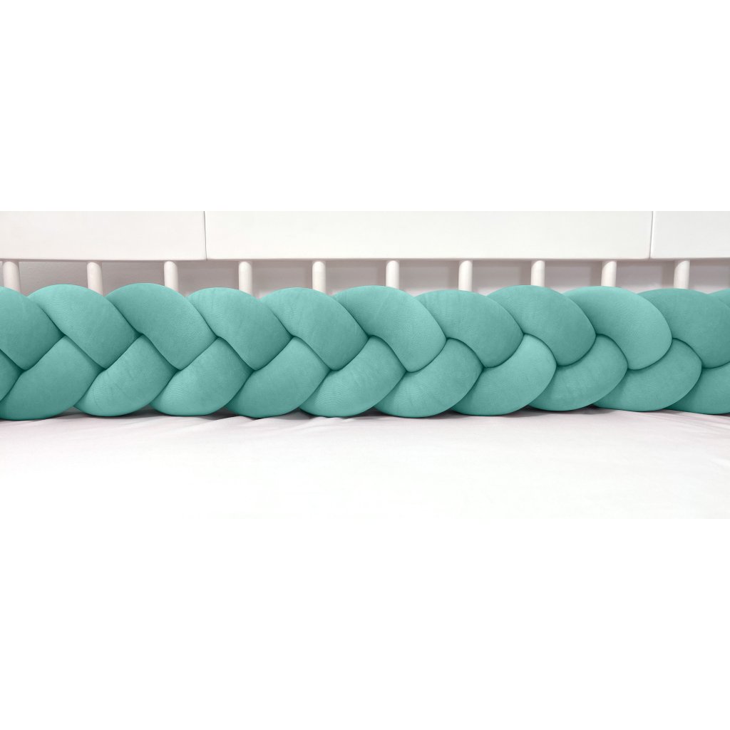 Plyšový ochranný zapletaný mantinel - pletenec trojitý slúži ako ochranca vášho dieťatka v postieľke a zároveň ako štýlový doplnok v detskej izbe. Pletenec má sadu ozdobných stúh na pripevnenie. Výška cca 15 cm, hrúbka cca 6 cm. Mantinel je dostupný v rôznych dĺžkach (od 120 cm do 400 cm). Všetky 3 pramene sú vyrobené z kvalitného Prémium bavlneného velúru (certifikát Oeko Tex Standard 100) a ručne spletené do vrkoča. Záruka najvyššej kvality – 100% Handmade. Farba: tmavá mäta, číslo vo vzorkovníku: 29.